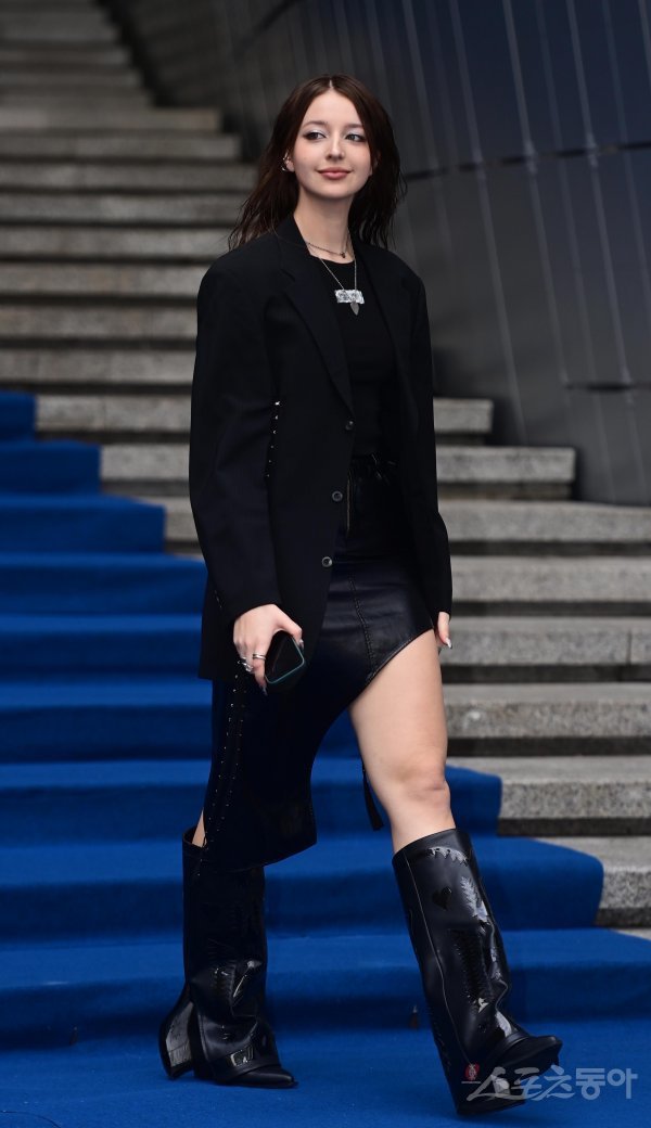 방송인 안젤리나 다닐로바가 15일 서울 중구 동대문디자인플라자에서 열린 ‘2023 FW 서울패션위크’ 얼킨(UL:KIN) 오프닝쇼 포토월에 오르고 있다.