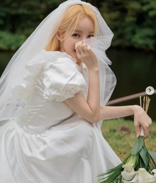 손으로 얼굴을 가리며 수줍게 미소를 짓고 있는 유깻잎은 웨딩드레스를 입어 순백의 자태를 드러냈다. 유깻잎은 금발머리로 신비로운 분위기까지 더했다. 최근 안면윤곽 시술 과정을 전하 바 있어 화제를 모은 바 있다.