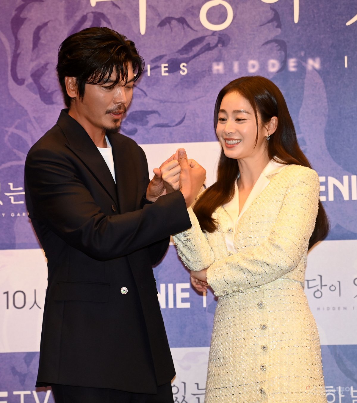 배우 김성오가 19일 서울 마포구 스탠포드호텔에서 열린 지니 TV 오리지널 드라마 ‘마당이 있는 집’ 제작발표회에서 김태희에게 손가락 하트를 알려주고 있다.