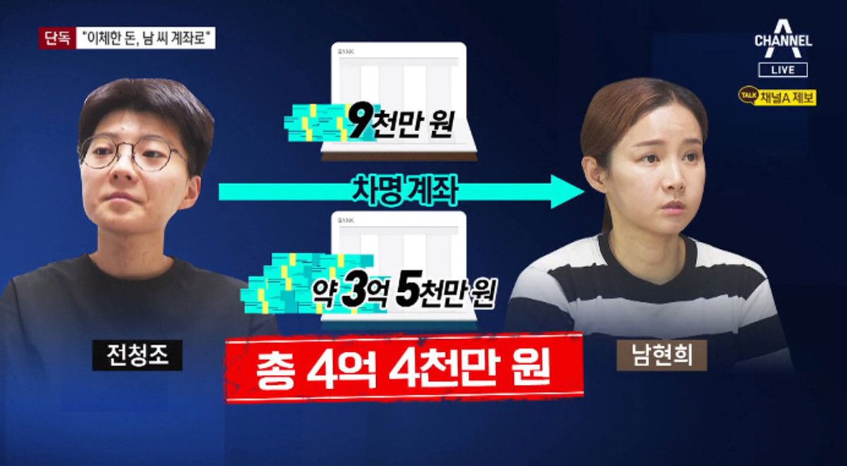 채널A는 10일 “전청조에게 11억 원을 투자했던 남현희 펜싱 아카데미 학부모 A 씨 부부가 송금한 돈이 남현희에게 흘러갔다고 주장한다”며 “입수한 전청조 차명계좌 내역를 들어야다 보니 학부모 A 씨 부부 돈을 포함해 남현희 계좌로 들어간 돈이 최소 4억 원이 넘었다”고 최초 보도했다.