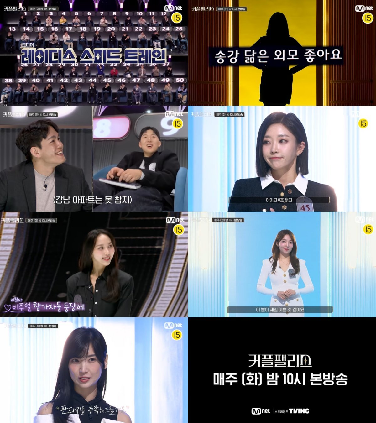 오늘(13일) 밤 10시 방송되는 Mnet \'커플팰리스(연출 이선영 CP, 정민석 PD)\' 3회에서는 역대급 스케일의 대규모 매칭쇼 \'스피드 트레인\'이 계속된다. 남성 출연진들이 모습을 드러낸 지난 1, 2회 방송에 이어 이번에는 여성 출연진들의 정체가 밝혀진다. 지난번과 반대로 여자들이 트레인에 올라 결혼의 조건과 스펙, 외모를 공개하면 남자들이 마음에 드는 여성에게 \'픽\' 버튼을 누르는 방식으로 진행될 예정이다. 과연 지난번 1:1 데이트 상대와 다시 매칭이 될지, 아니면 새로운 상대에게 \'픽\' 버튼을 누르게 될지도 관전 포인트가 될 전망이다.