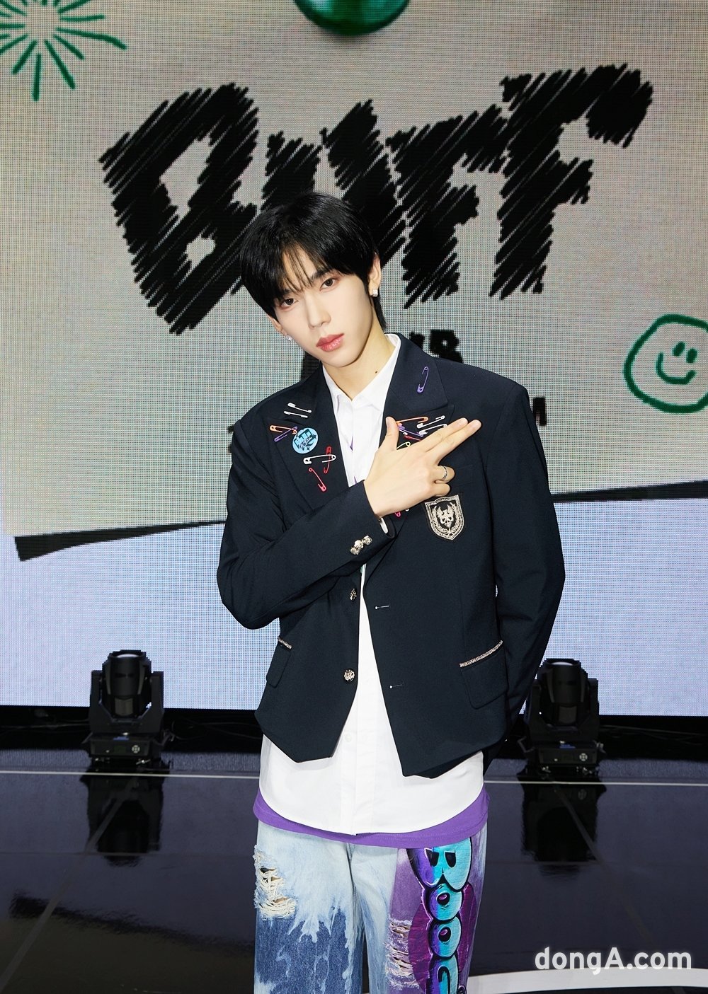 루네이트(LUN8) 카엘이 13일 서울 광진구 예스24라이브홀에서 진행된 두 번째 미니앨범 ‘BUFF’ 발매 기념 쇼케이스에서 포즈를 취하고 있다.
