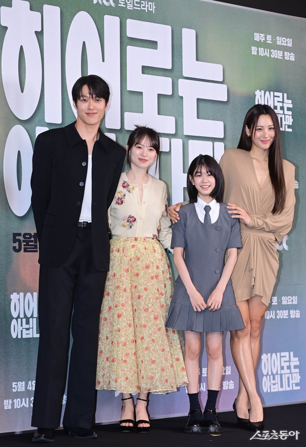 배우 장기용, 천우희, 아역배우 박소이, 수현이 2일 서울 마포구 상암동 스탠포드호텔 서울에서 열린 JTBC 새 토일드라마 ‘히어로는 아닙니다만’ 제작발표회에서 포즈를 취하고 있다.