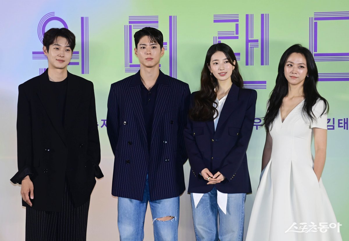 배우 최우식, 박보검, 수지, 탕웨이가 9일 서울 용산구 CGV용산아이파크몰점에서 열린 영화 ‘원더랜드’ 제작보고회에서 포즈를 취하고 있다.