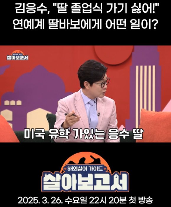 첫 방송을 앞두고 공개된 쇼츠에서 김응수는 연예계 대표 ‘딸바보’임에도 “딸 졸업식에 가기 싫다”고 돌발 선언한다. MC 김성주가 “따님이 미국에서 공부 중인데 졸업식은 가셔야 하지 않냐?”라고 묻자, “5월 14일에 졸업하는데, 전 안 갈 거다”라며 불참을 선언하는 것.