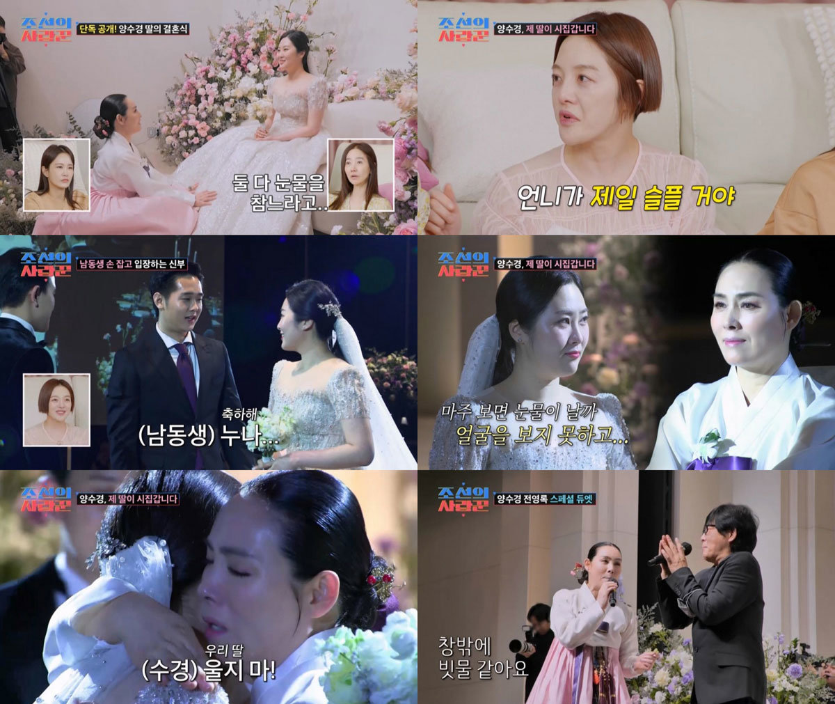 14일 방송된 TV CHOSUN ‘조선의 사랑꾼’에서는 ‘8090 레전드 가수’ 양수경이 마음으로 품어 16년간 키운 딸 윤채영의 결혼식이 공개됐다. 신부 대기실에서 딸의 웨딩드레스 입은 모습을 마주한 양수경은 “울지 말자, 서로 코만 보자”며 눈물을 참았다. 하지만 시선을 마주치지 않는 노력(?)에도 눈시울이 붉어졌다. 이를 지켜본 ‘딸 맘’ 강수지는 “(나중에) 신부 대기실에 들어가지 말아야겠다”며 과몰입해 웃음을 자아냈다.