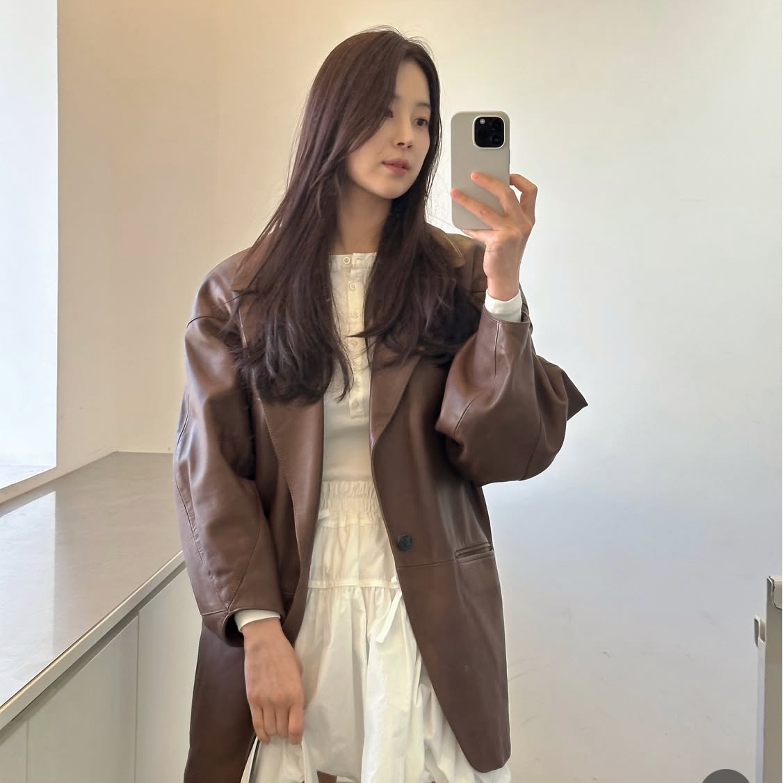 화이트 미니 드레스는 러블리한 무드를 완성해주고, 여기에 오버핏 브라운 레더 재킷을 걸쳐 소녀미와 시크함을 동시에 잡았다. 과하지 않은 루즈핏이 오히려 여유로운 멋을 살려주며, 톤다운된 브라운 컬러가 봄 햇살과 절묘하게 어우러졌다.