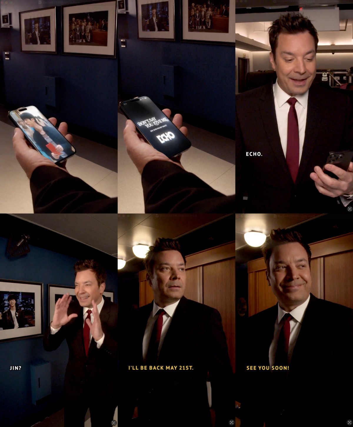 지미 팰런쇼는 지난 14일 밤 공식 SNS에 진의 출연을 예고하는 영상을 깜짝 공개했다. 영상에서 진행자 지미 팰런이 휴대전화로 진의 신곡 ‘Don’t Say You Love Me’ 티저를 감상하며 “ECHO…”라고 속삭이는 장면이 담겼다.