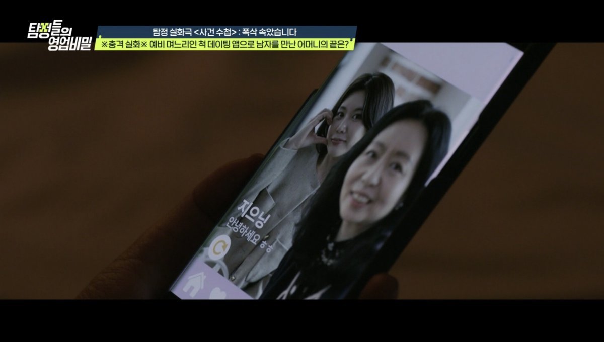 그러나 탐정단의 조사 결과 아버지와 예비 장모는 과거 같은 대학을 다녔던 동문 사이일 뿐이었다. 불륜을 저지르고 있는 사람은 주인공의 아버지가 아닌 어머니였던 것으로 밝혀져 충격을 더했다. 주인공의 어머니는 데이팅 앱으로 예비 며느리의 사진과 영상을 도용해 젊은 남자들과 부적절한 관계를 갖고 있었다. 주인공의 어머니는 “남자들의 관심을 받기 위해선 예쁜 며느리의 사진이 필요했다”고 울부짖었다. 이날 일일 탐정으로 함께한 개그맨 신규진은 “난 저 마음을 안다. 데이팅 앱 가입하려다 여성들의 거부로 세 번 정도 탈락한 적이 있다. 사진을 보정해서 어렵게 가입하긴 했지만 매칭에는 실패했다”며 웃픈 데이팅 앱 경험담을 전하기도 했다.