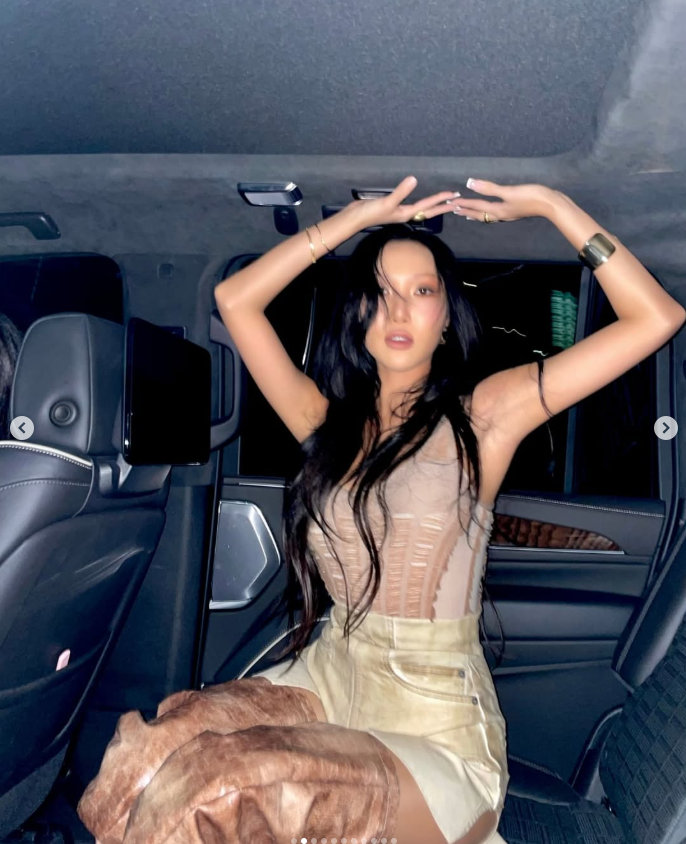 사진 속 화사는 차 안에서 남다른 분위기를 연출한다. 무대 의상으로 추정되는 옷을 입고 섹시한 눈빛을 발사한다. 이날 화사는 동의대학교 축제 무대에 올랐다. 특유의 무대 매너로 축제 현장을 사로잡았다.