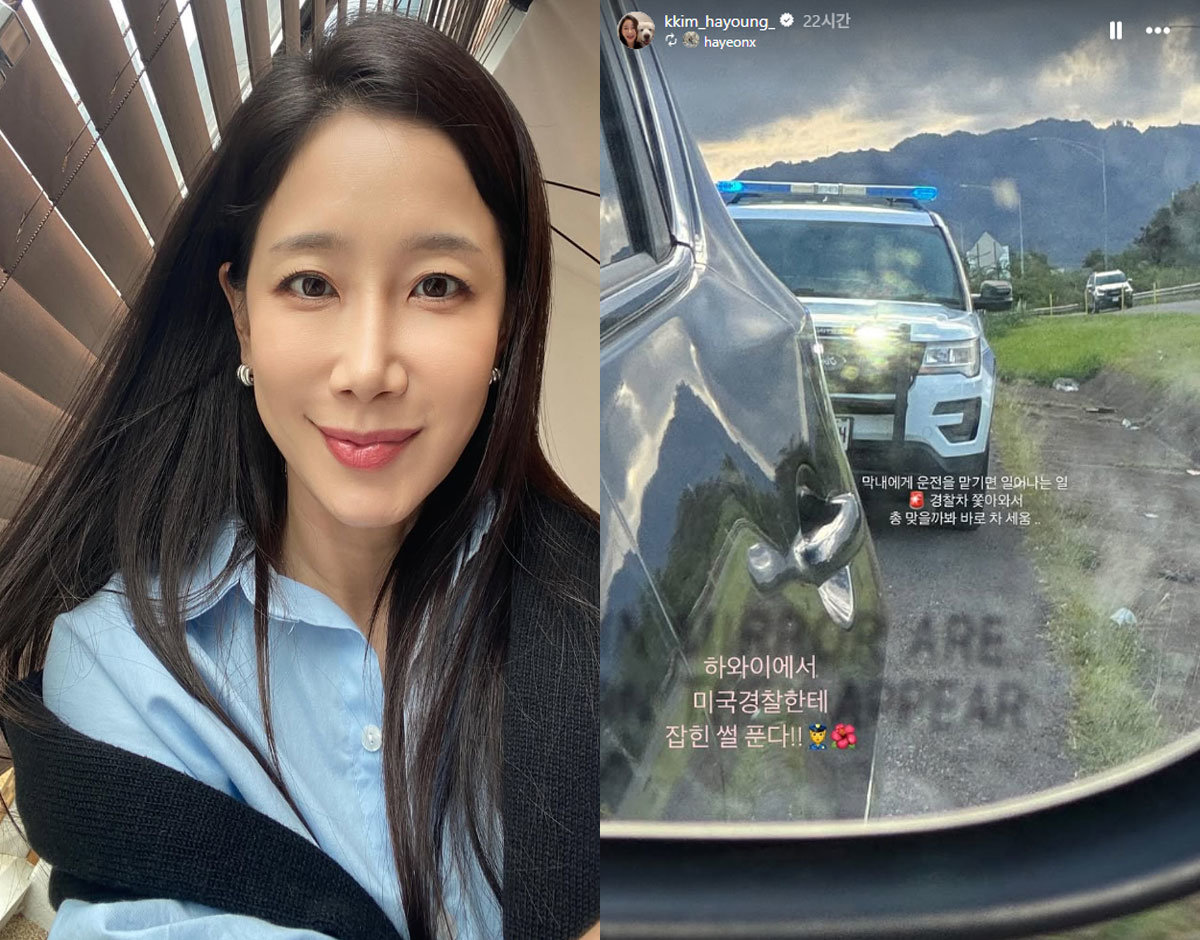김하영은 27일 자신의 SNS에 “하와이에서 미국 경찰한테 잡힌 썰 푼다!!”는 글과 사진을 공개했다. 사진에는 사이드 미러를 통해 경찰차가 뒤따르고 있는 모습이 보인다.
