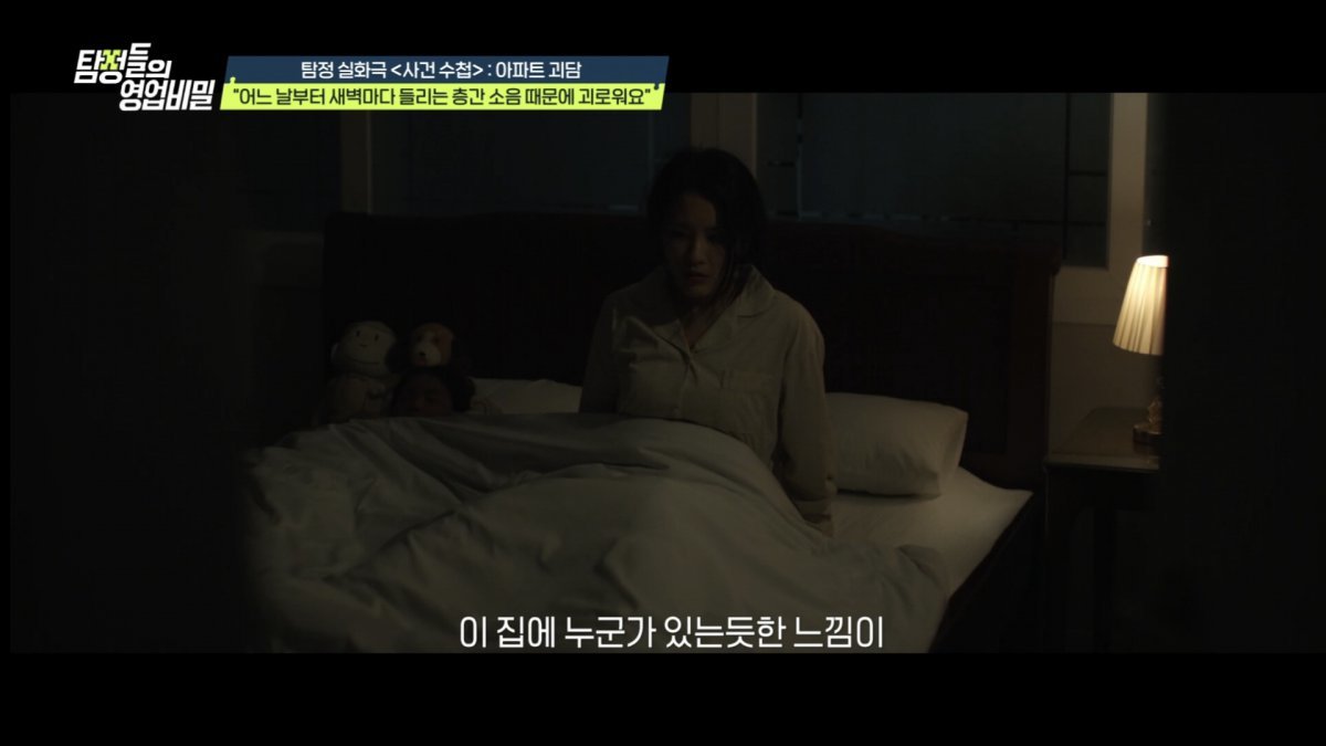 오늘(2일) 밤 9시 30분에 방송되는 채널A ‘탐정들의 영업비밀’ 속 실화 재구성 코너인 ‘사건 수첩’에서는 매일 밤 들리는 정체 불명의 층간 소음 때문에 괴로워하는 한 여성이 등장한다. 주인공은 어느 날부턴가 새벽마다 ‘끼익끼익’ 끌리는 소리에 잠에서 깨는가 하면, 그로 인해 괴로워하다 악몽에까지 시달리며 하루가 다르게 쇠약해져간다. 주인공의 남편은 아내가 지나치게 예민한 것이라며 오히려 화를 내고, 위층과 아래층, 옆집까지 찾아가 소리의 원인을 찾으려 했지만 이마저도 실패한다.