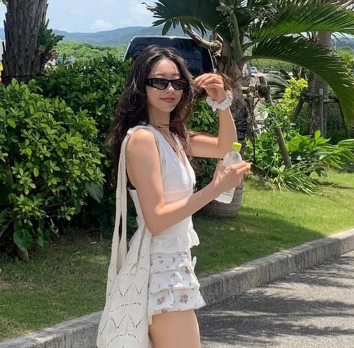 사진 속 경리는 이국적인 휴양지를 배경으로 시원한 여름 휴가 패션을 뽐내고 있다. 흰 레이스 민소매와 짧은 길이의 하의 차림으로는 경리만의 섹시한 분위기를 더했다.