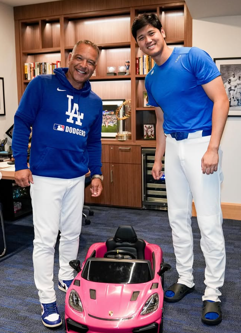메이저리그 스타 오타니 쇼헤이와 LA 다저스의 로버츠 감독이 또 한 번 유쾌한 선물 공방전을 펼쳤다. 이번엔 오타니의 딸을 위한 깜찍한 ‘포르쉐’가 등장했다.