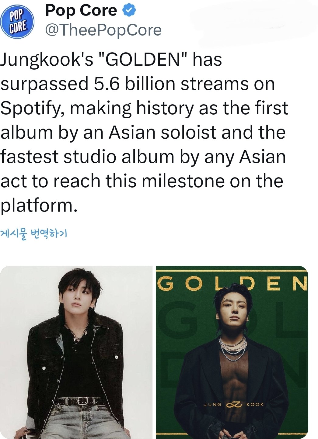 BTS 정국이 ‘금손’이라는 수식어를 다시 한 번 증명했다. 첫 솔로 앨범 ‘GOLDEN’이 세계 최대 음원 스트리밍 플랫폼 스포티파이에서 누적 56억 스트리밍을 돌파하며 K팝 솔로 아티스트 사상 유례없는 기록을 만들어냈다.‘GOLDEN’은 2023년 11월 발매된 이후, 불과 7개월 만에 아시아 아티스트 정규 앨범 중 역대 최단 기간으로 56억 스트리밍 고지를 찍었다. 동시에, 아시아 솔로 가수 앨범 최초로 56억 스트리밍을 달성한 앨범이 됐다. 그야말로 정국만이 가능한 숫자다.