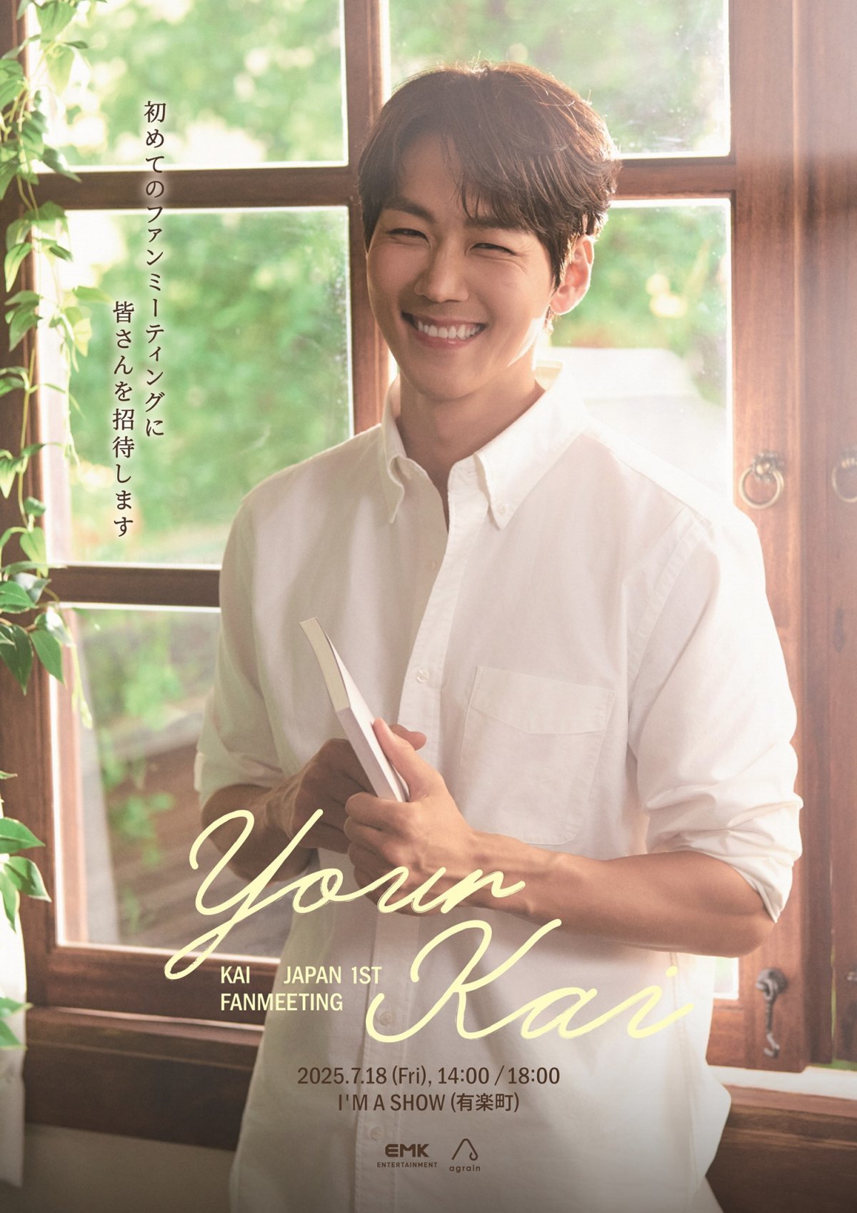 소속사 EMK엔터테인먼트는 16일 “카이가 7월 18일 금요일 오후 2시와 6시, 도쿄 ‘I AM A SHOW’ 극장에서 팬미팅 ‘YOUR KAI’를 개최한다”고 밝혔다. 이번 팬미팅은 카이가 일본 팬클럽을 창단한 것을 기념해 마련된 첫 공식 행사로 노래와 토크, 배웅회(하이바이회) 등으로 다채롭게 꾸며질 예정이다.