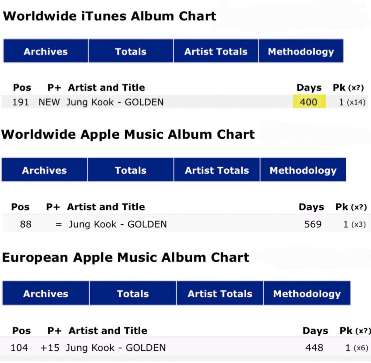 2023년 11월 발매된 ‘GOLDEN’은 ‘월드와이드 아이튠즈 앨범’ 차트에 400일 연속 진입했다. 단일 앨범으로는 이례적인 기록이다. 유럽 아이튠즈 앨범 차트에서도 200일 동안 꾸준히 이름을 올리며 유럽 팬들의 지지 또한 입증했다.