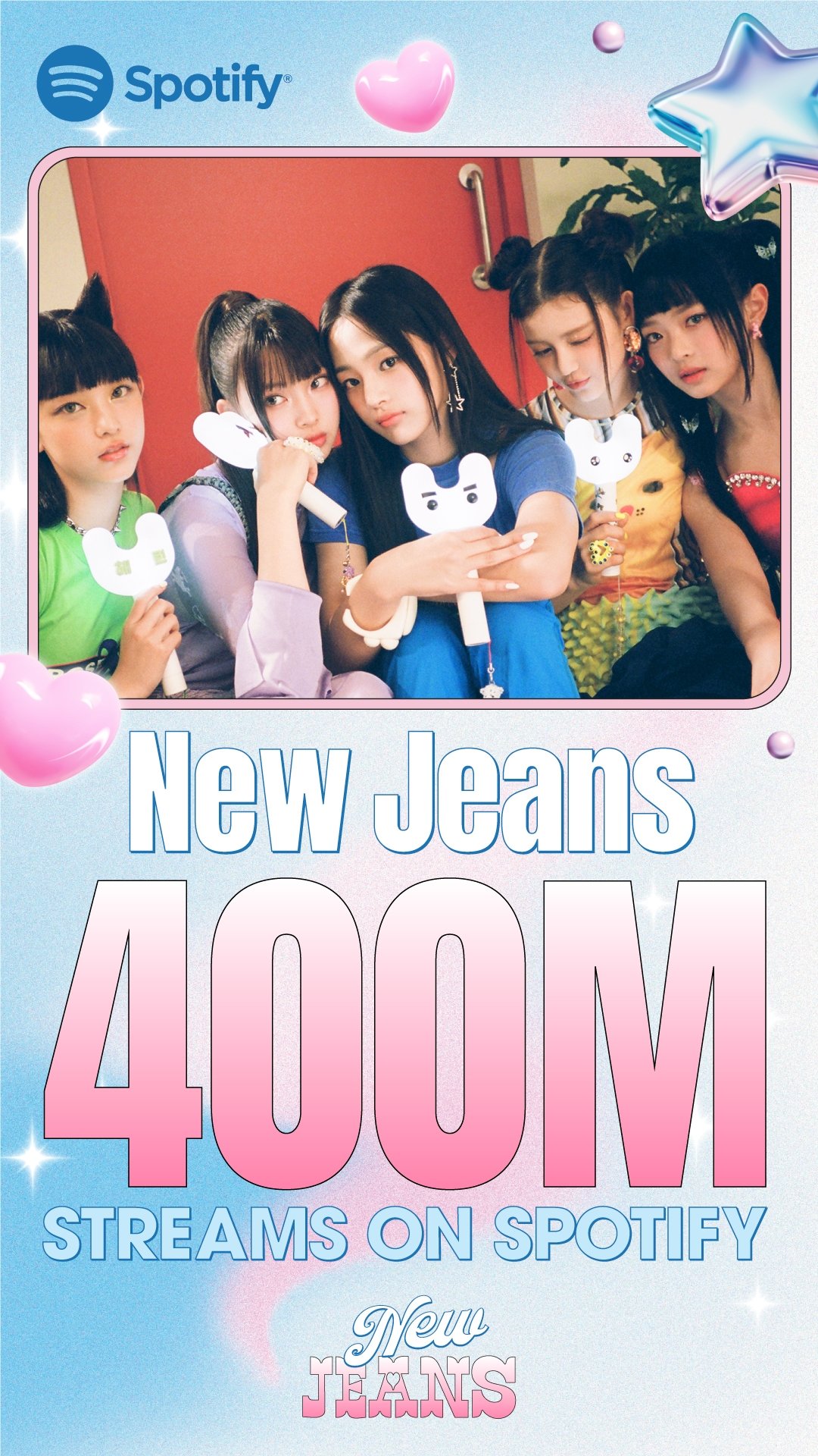 뉴진스는 지금까지 총 15개의 스포티파이 억대 스트리밍 곡을 배출했다. ‘OMG’가 8억 회 이상, ‘Ditto’와 ‘Super Shy’가 7억 회 이상, ‘Hype Boy’가 6억 회 이상, ‘Attention’와 ‘New Jeans’가 4억 회 이상, ‘ETA’가 3억 회 이상, ‘Cookie’와 ‘Hurt’, ‘Cool With You’, ‘How Sweet’가 2억 회 이상, ‘ASAP’와 ‘Get Up’, ‘Supernatural’, ‘Bubble Gum’이 각각 1억 회 이상 스트리밍됐다. 뉴진스가 지금까지 발표한 모든 노래의 스포티파이 합산 누적 스트리밍 횟수는 63억 회를 넘는다.