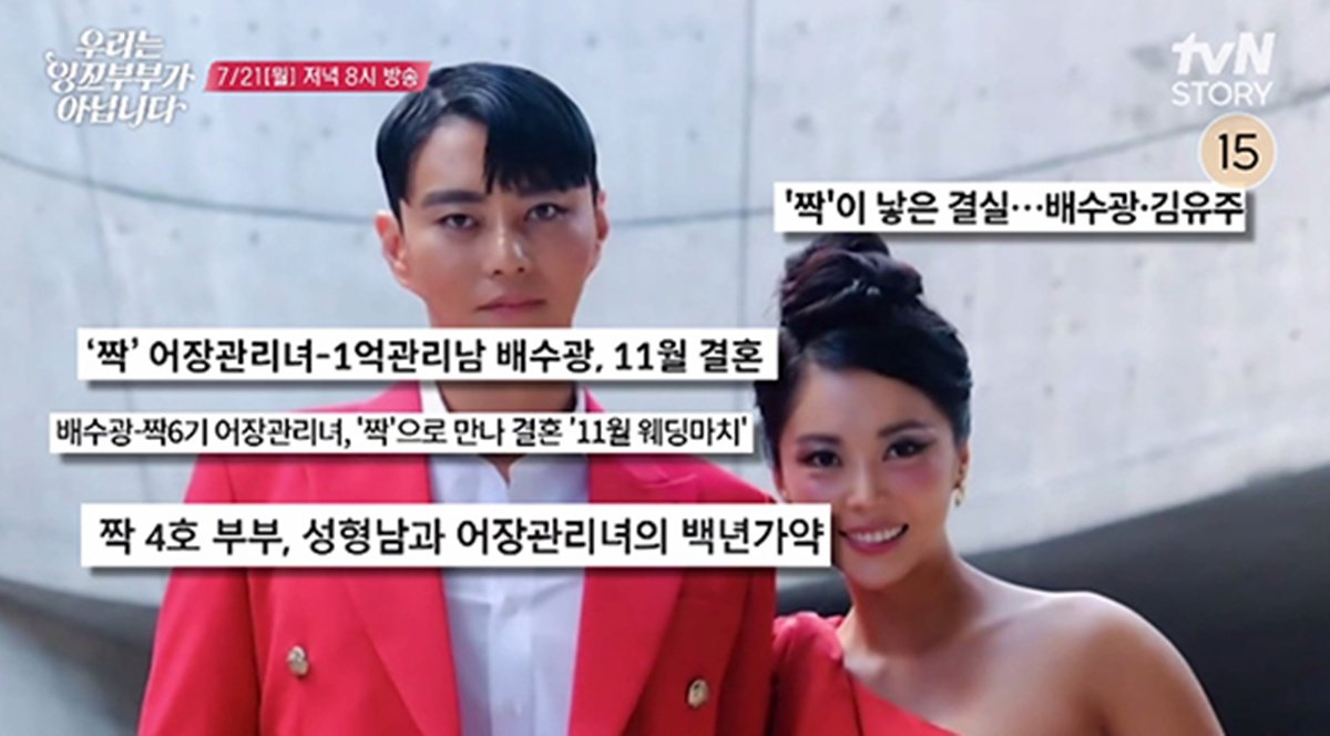 tvN STORY 부부 고민 거울 치료 드라마 테라피 ‘우리는 잉꼬부부가 아닙니다’ 4회에는 인기 예능 ‘짝’에 출연한 것이 인연이 되어 결혼까지 골인한 배수광, 김유주 부부가 출연한다.