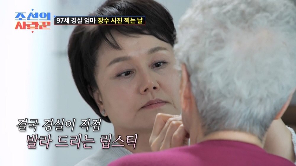 사진을 찍으러 가기 전, 이경실은 손수 어머니의 화장을 도왔다. 어머니가 서툴게 립스틱을 바르자, 이경실은 “왜 이렇게 못 바르냐. 옛날에는 잘만 발랐으면서”라며 속상한 마음을 감추고 립스틱을 조심스레 대신 발라드렸다. 이 모습을 지켜보던 김국진은 결국 참았던 눈물을 흘렸다.