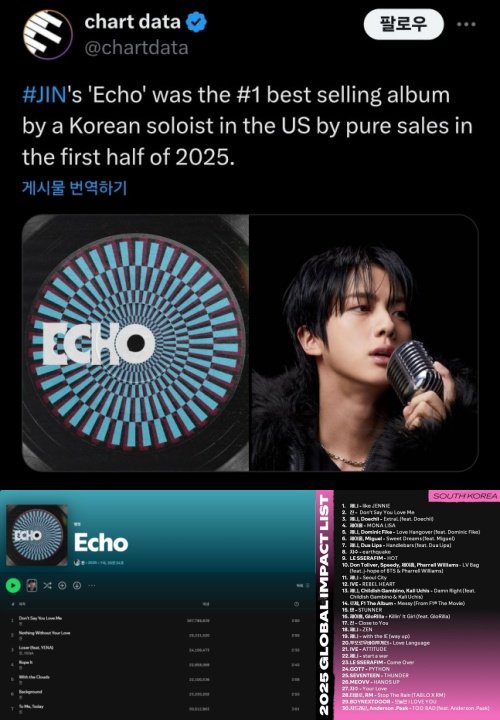 미국 음악 시장 전문 집계 사이트 ‘차트 데이터(Chart Data)’에 따르면, 진의 ‘Echo’는 상반기 말에 발매됐음에도 2025년 상반기 전체 순수 앨범 판매량 1위에 올랐다. 보통 발매 시기가 빠를수록 유리한 구조지만, 진은 그 흐름을 깨고 정상을 밟았다. 진의 음악성과 브랜드 파워, 그리고 글로벌 팬덤의 결집력을 보여주는 지표로 읽힌다.