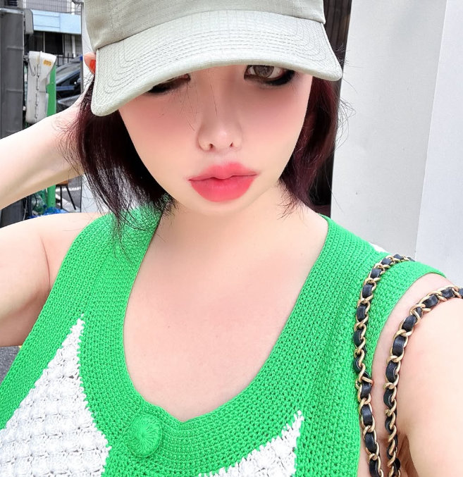 사진 속 그는 연한 카키 컬러의 모자를 푹 눌러쓴 채 카메라를 지그시 바라봤다. 진하게 그린 언더 아이라인으로 과감한 메이크업을 선보인 가운데 사이드붑(옆가슴을 노출하는 스타일) 니트를 입고 시원한 서머룩을 완성했다. 초록색 의상에 맞춘 센스 넘치는 네일아트까지 인상적. 박봄은 시크하면서도 도도한 느낌을 자아내며 시선을 사로잡았다.
