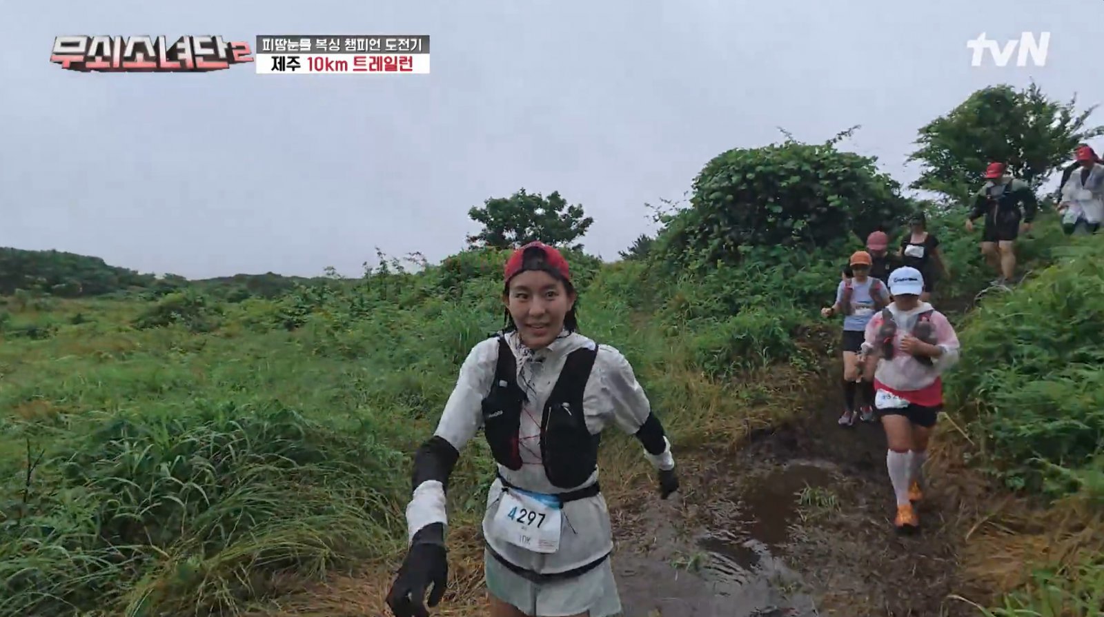 용기를 내어 내리막길을 통과한 뒤에는 미끄러운 진흙으로 된 급경사 내리막길이 나타나 많은 참가자들과 함께 정체된 진흙 내리막길에 발이 묶였다. 그런 가운데 갑자기 박주현이 등장, 이목을 집중시켰다. “인생은 장비빨”을 외치며 따라비오름 입구부터 등산스틱과 함께했던 박주현은 장비에 대한 무한 신뢰를 보이며 진흙 내리막길도 뚫고 내려가는 광기로 유이를 추월해 웃음을 자아냈다.