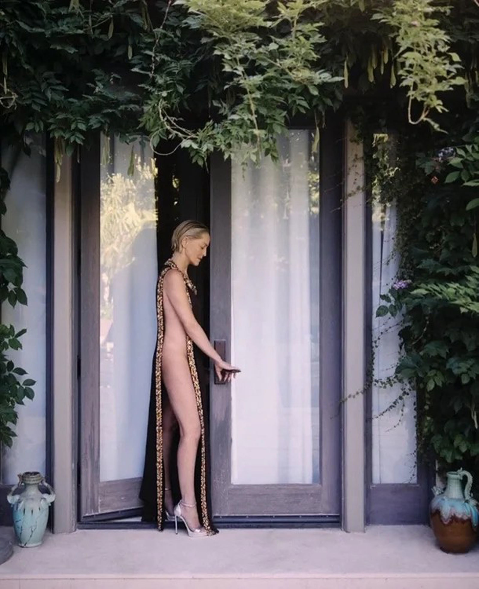 사진 속 샤론 스톤은 과감하면서도 우아한 포즈로 눈길을 사로잡는다. 첫 번째 사진에서 그녀는 골드 장식이 들어간 올 누드에 블랙 로브만 걸친 채 당당한 실루엣을 드러내며, 시선을 압도하는 카리스마를 발산했다.