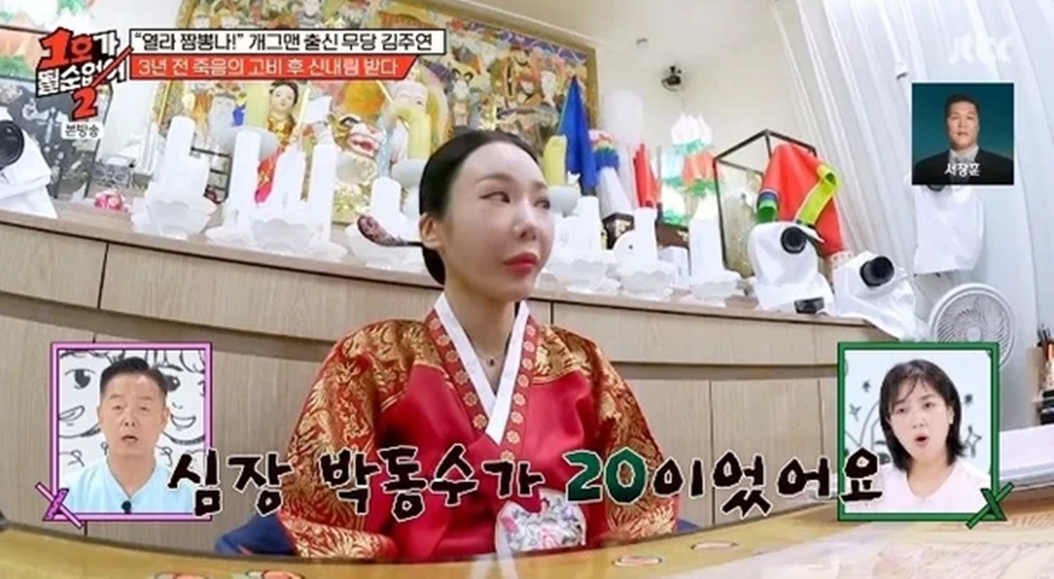 김주연은 무속인이 된 이유에 대해 “신병을 앓았다. 하혈을 2년을 했다. 갑자기 열이 펄펄 나더라. 못 나가겠더라. 두 달간 먹지도 자지도 못했다. 체중이 12㎏정도 빠졌다. 정신건강의학과를 찾았는데 이상은 없다더라. 신병인지 전혀 몰랐다. 신병에 대해 아는 것도 없고 집안 내력도 없었다”고 말했다.