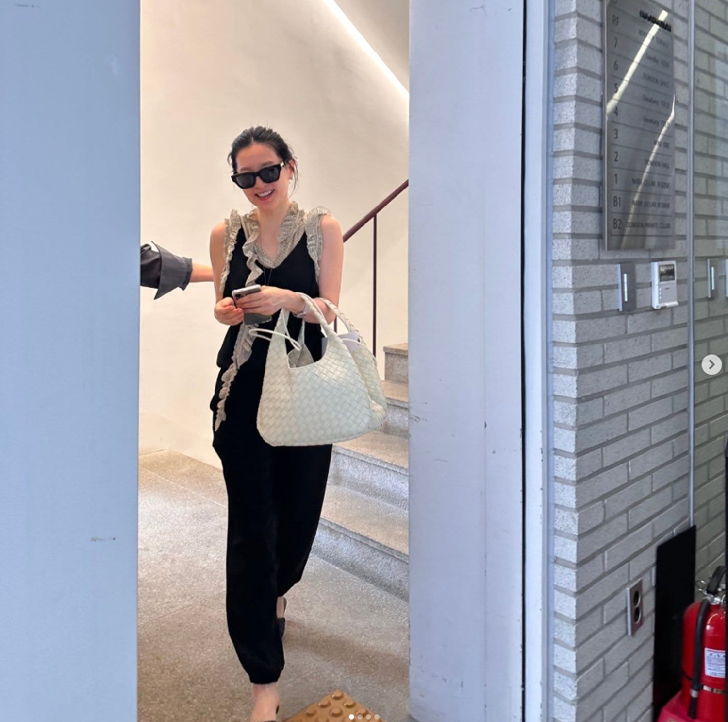 공개된 사진에는 블랙 의상을 입고 등장한 이영애 모습이 담긴다. 선글라스, 토드백 등 미니멀한 아이템으로 데일리룩을 완성한 이영애는 멋스러운 분위기를 완성했다. 계단에 서 있음에도 마치 스튜디오를 연상하게 하는 존재감이다.
