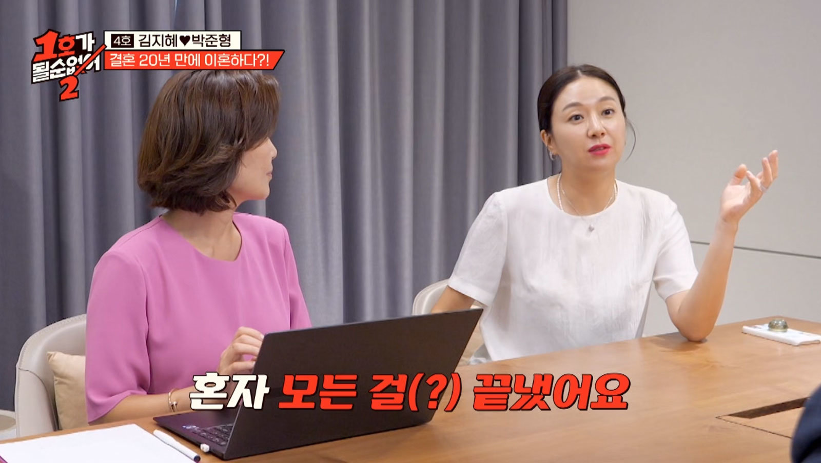 28일 방송된 JTBC 예능 ‘1호가 될 순 없어2’ 14회에서는 결혼 21년 차 김지혜·박준형 부부가 ‘이혼 체험’ 프로젝트에 참여하는 모습이 전파를 탔다. 이날 두 사람은 각각 이혼 전문 변호사를 대동하고 4자 회담을 진행했다.