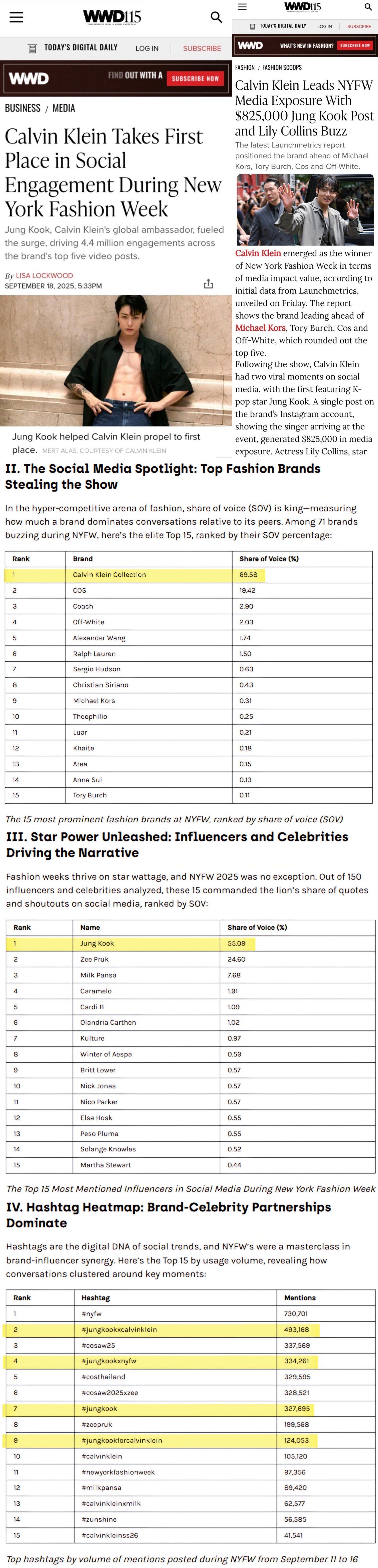 정국이 참석한 9월 13일 하루 동안 X(구 트위터)에서는 130만 개 이상의 게시물이 생성되며, 그는 ‘가장 많이 언급된 뮤지션’으로 기록됐다. 글로벌 PR 분석 플랫폼 온클루시브(Onclusive)의 크리스토프 아셀린은 뉴욕 패션위크 기간 중 브랜드 영향력(SOV) 상위 15개를 분석한 결과, 캘빈클라인 컬렉션이 69.58%로 압도적인 1위를 차지했다고 밝혔다.