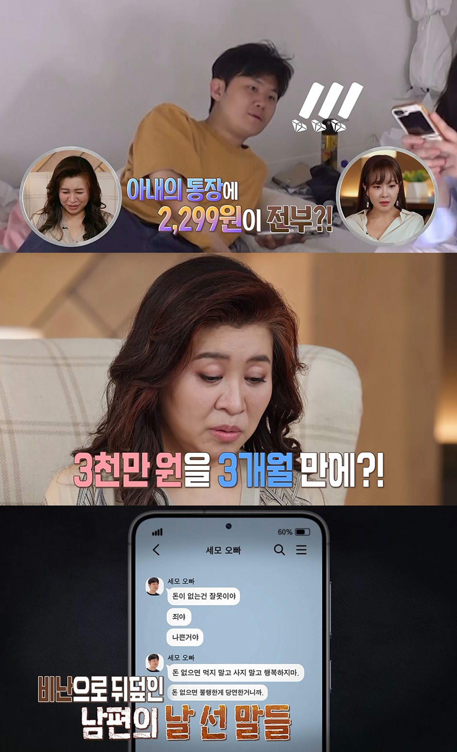그런가 하면, 아내는 남편의 막말 때문에 언젠가 한계가 올 것 같다고 토로한다. 이날 아내가 공개한 과거 남편의 문자 메시지에는 “돈이 없으면 행복하지도 마”라며 아내의 소비 패턴을 비난하는 날 선 내용들이 담겨 있었다. 아내는 “남편이 무시할 때마다 쓰레기가 된 기분”이라며 눈물로 호소한다.