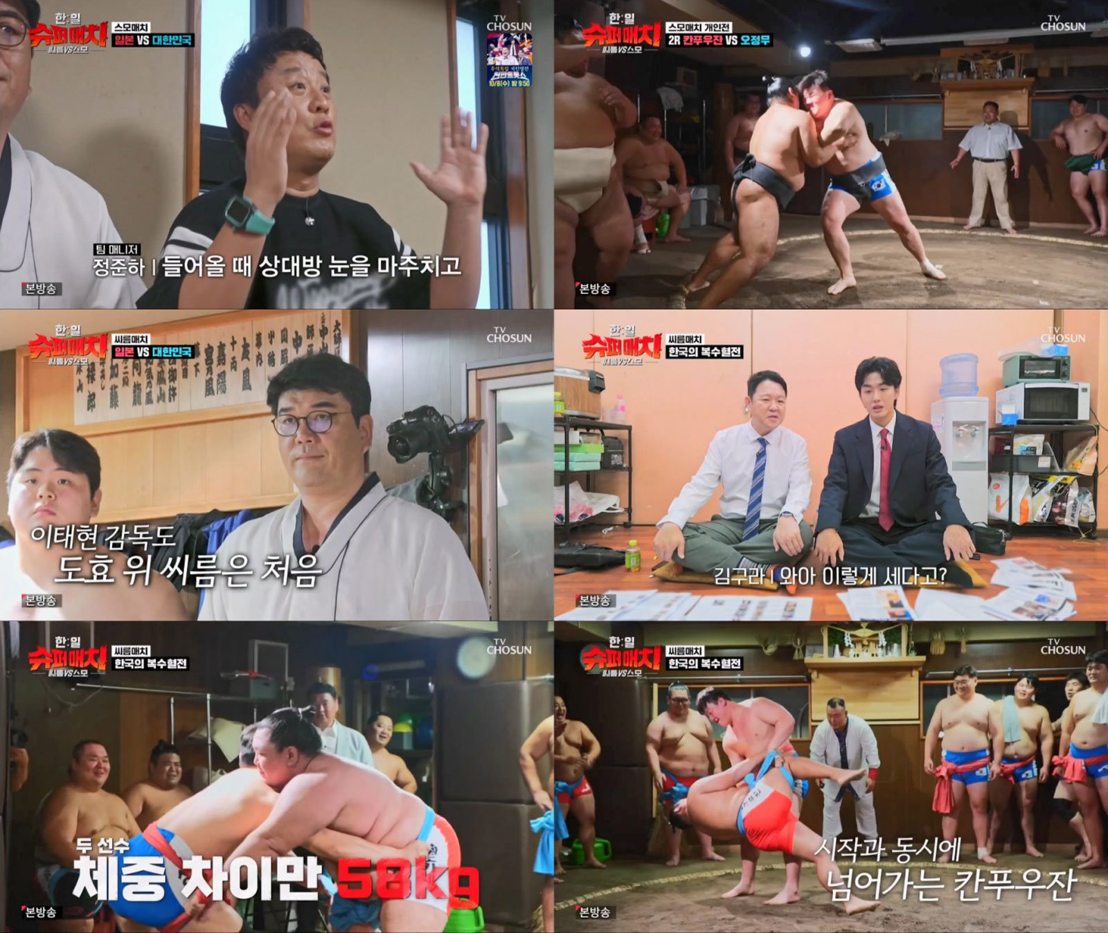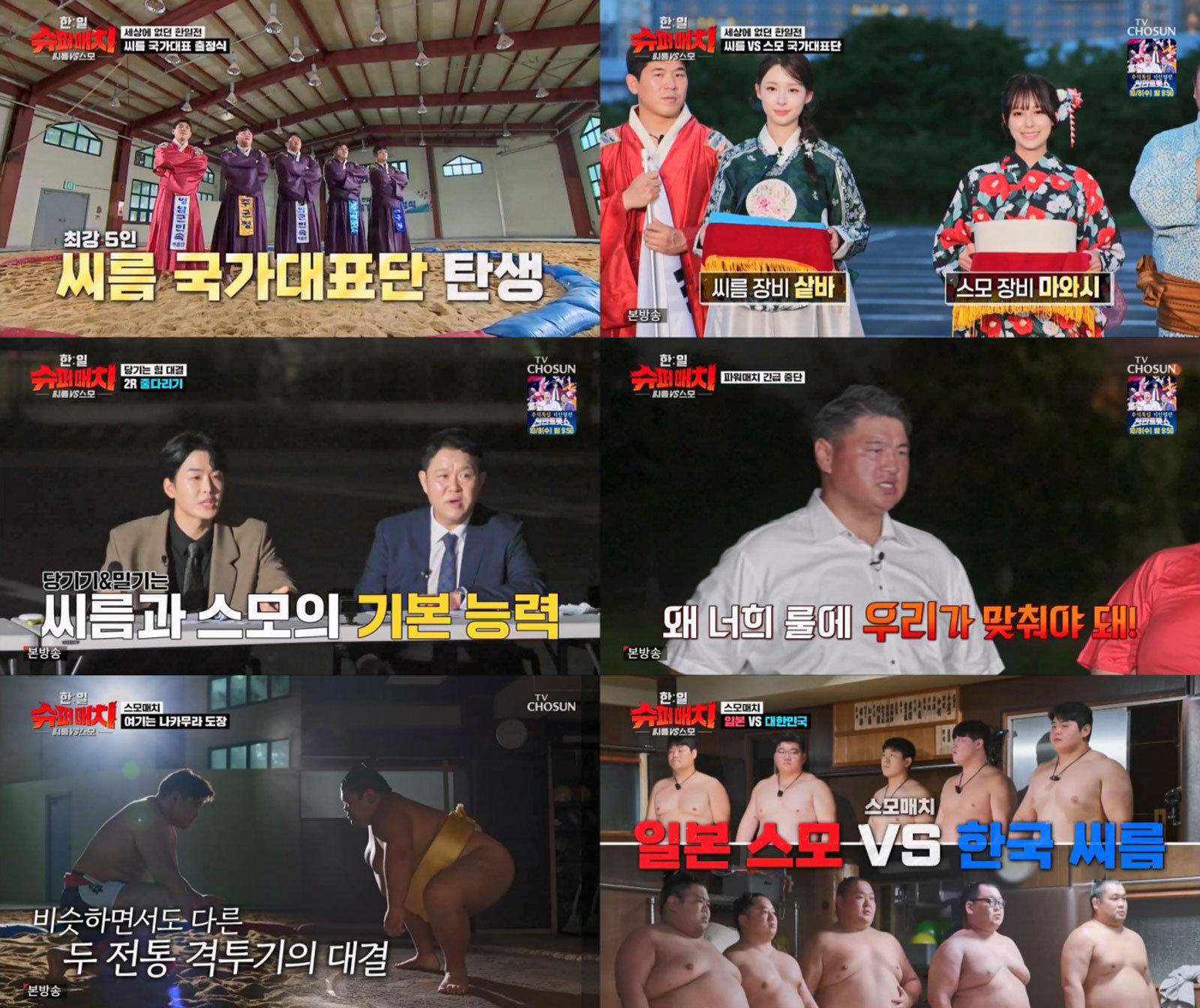 6일 첫 방송된 TV CHOSUN 추석특집 ‘한일슈퍼매치: 씨름vs스모’에서는 세상에 없던 한일전인 ‘씨름vs스모’ 프로들의 경기를 위해 모래판을 지배하는 현역 최강 ‘씨름 괴물’ 김민재, 파워 담당하는 오정무, IQ151의 멘사 출신 주장 최성환, 변칙 기술의 황제 임진원, 빠른 스피드와 유연함이 돋보이는 슈퍼루키 홍지흔까지 한국의 프로 씨름 선수들이 나섰다. 이들을 이끄는 사령관으로 역대 백두장사 최다 우승 기록을 쓴 이태현 감독이 출격했다. 전략분석관 김구라, 정 많은 팀 매니저 정준하, 캐스터 조정식도 함께했다.