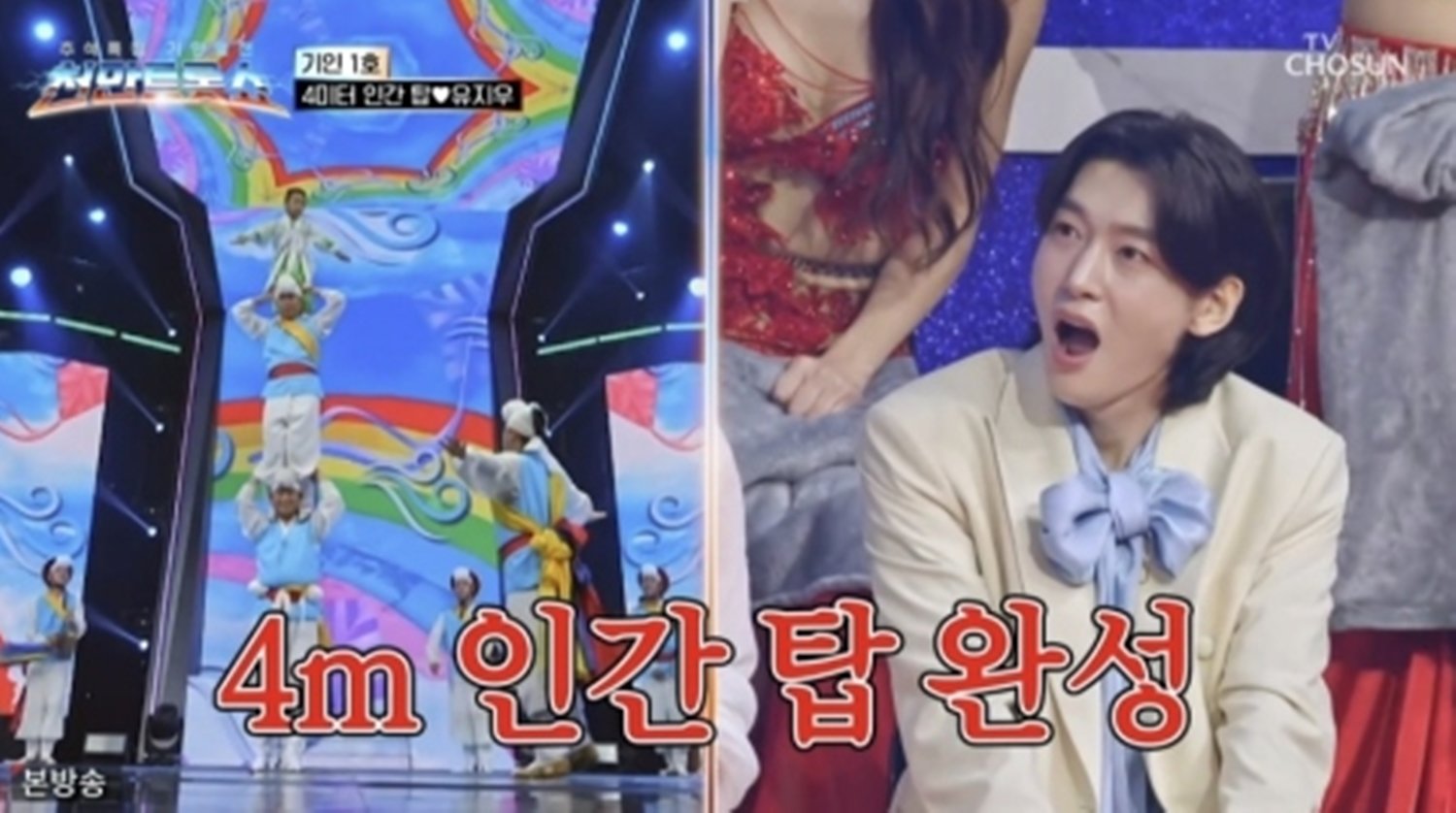 가장 먼저 무대에 나선 건 트롯 신동 유지우와 ‘4미터 인간 탑’ 무동 기인이었다. 6세 무동 기인은 성인 두 명의 어깨 위에 올라 놀라운 균형 감각으로 아슬아슬한 동작을 완벽히 해내며 객석을 압도했다. 이어 등장한 유지우는 성인 두 명이 차곡히 쌓은 4m 높이의 무동 탑 맨 꼭대기에서 ‘풍악을 울려라’를 완벽하게 완창, 단 한 치의 흔들림 없는 가창으로 모두를 놀라게 했다. 이를 지켜본 김용임은 “아이들 재롱잔치가 아니었다. 우리 지우가 기인이 됐다”라며 입을 떡 벌리고 감탄을 쏟아냈다.