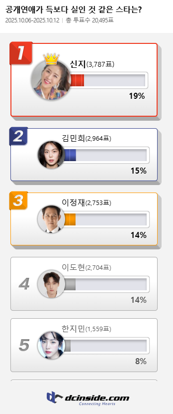 커뮤니티 포털사이트 디시인사이드가 6일부터 12일까지 총 7일간 진행한 설문에서 신지가 1위에 올랐다.