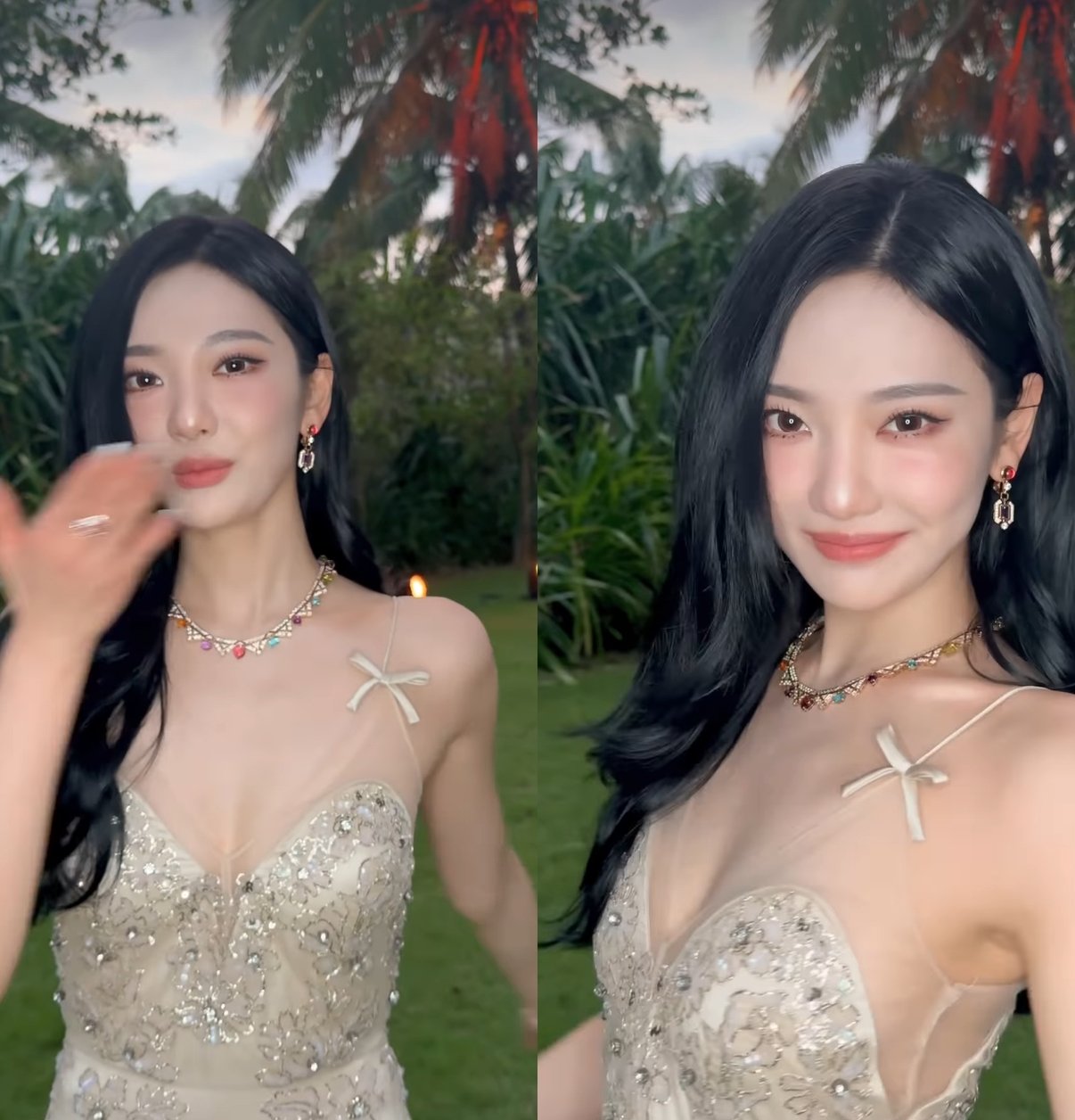 플리츠 스타일의 파란색 투피스부터 그물 느낌의 백리스 원피스, 가슴라인이 과감하게 파인 모노키니 등 다양한 스타일링을 완벽 소화한 닝닝. 그는 사랑스러운 골드 드레스를 입고 아름다운 자태를 뽐내며 우아한 분위기를 자아내기도 했다.