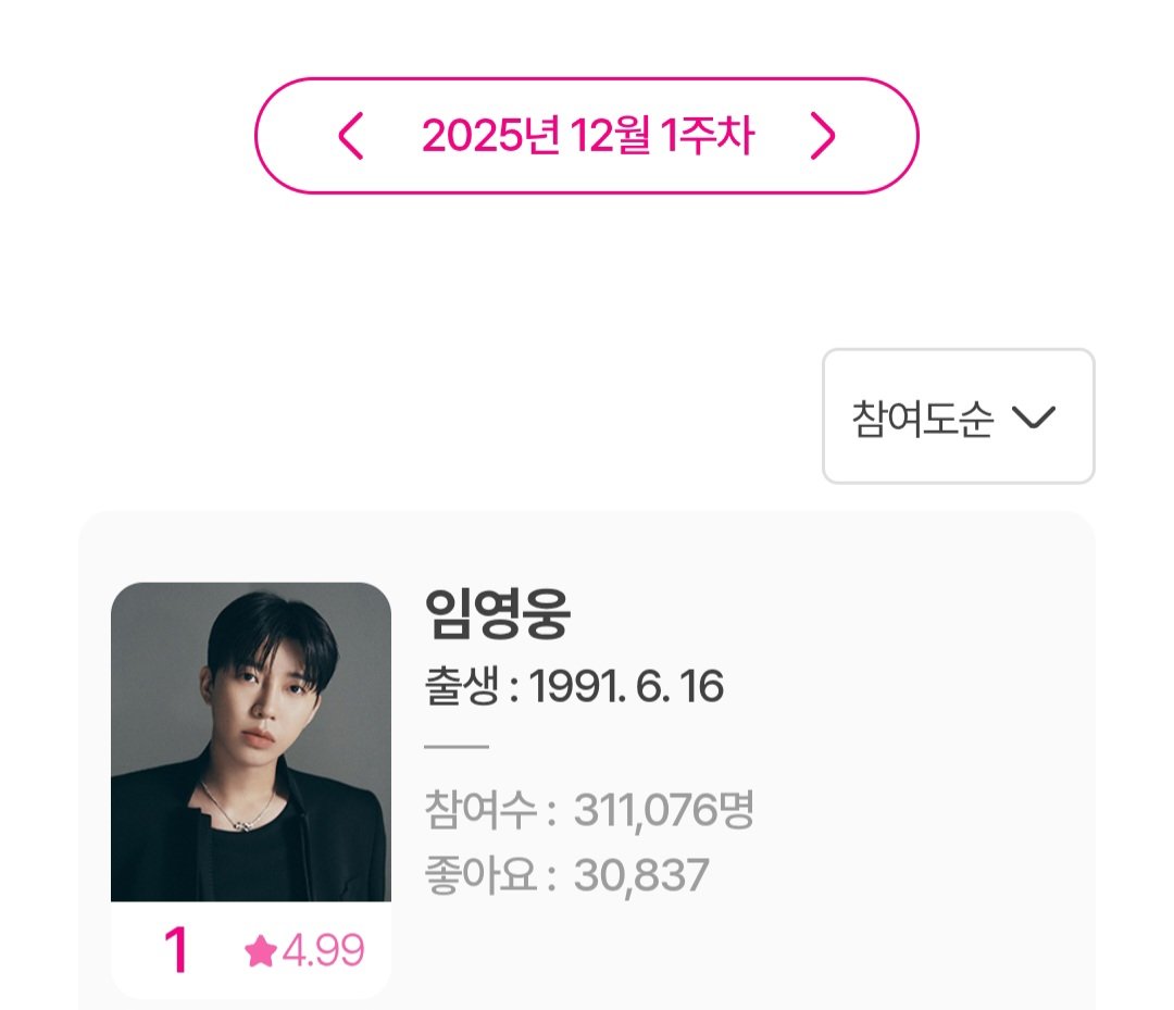 아이돌차트에 따르면 12월 1일부터 12월 7일까지 집계된 평점랭킹에서 임영웅은 311076표를 얻어 이번 주 1위를 기록했다. 이로써 245주 연속 1위에 오르며 독보적인 기록을 이어가게 됐다.