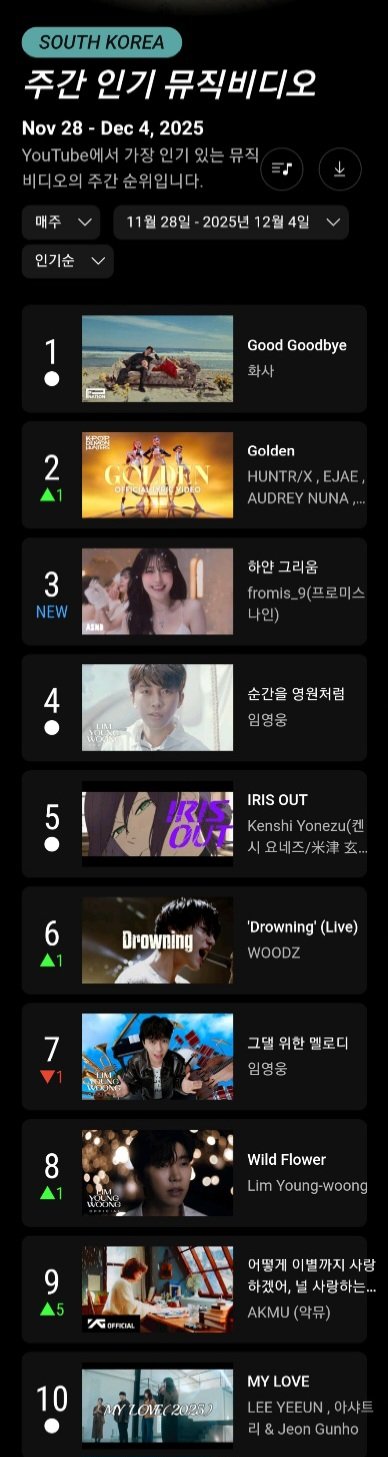 10월 30일 공개된 ‘들꽃이 될게요’ 역시 유튜브 인기 순위권에 재진입하며 존재감을 드러냈다. 뮤직비디오에서 임영웅은 섬세한 표정 연기로 특유의 짙은 감성을 전했고, 영상은 꾸준한 조회수 상승세를 이어갔다.