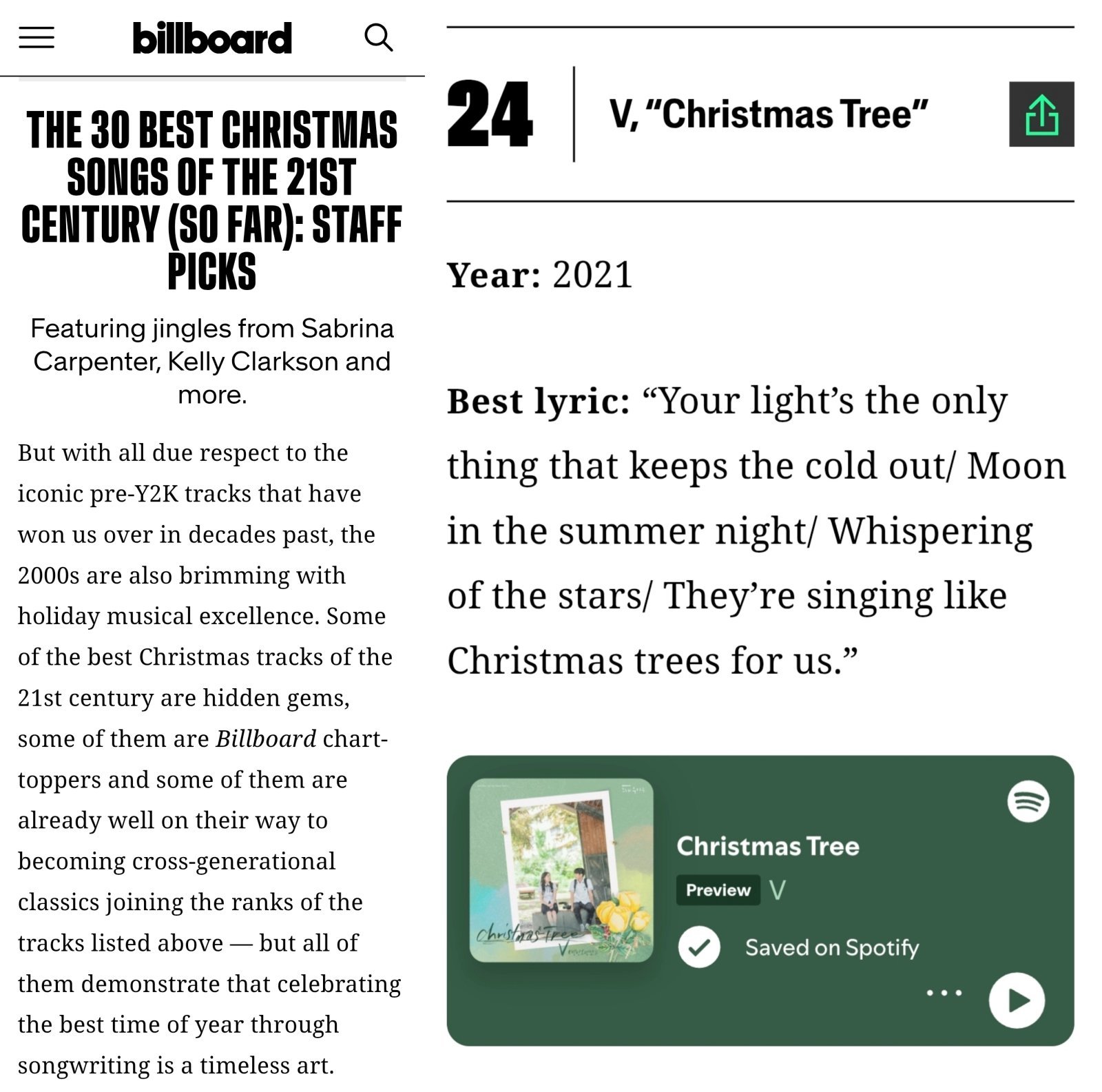 방탄소년단 뷔의 ‘크리스마스트리(Christmas Tree)’가 빌보드가 선정한 ‘21세기 최고의 크리스마스 송 30’에 2년 연속 이름을 올렸다. 지난해 19위에 이어 올해는 24위에 올랐고, K팝 가운데 유일한 선정이라는 점에서 의미를 더했다.