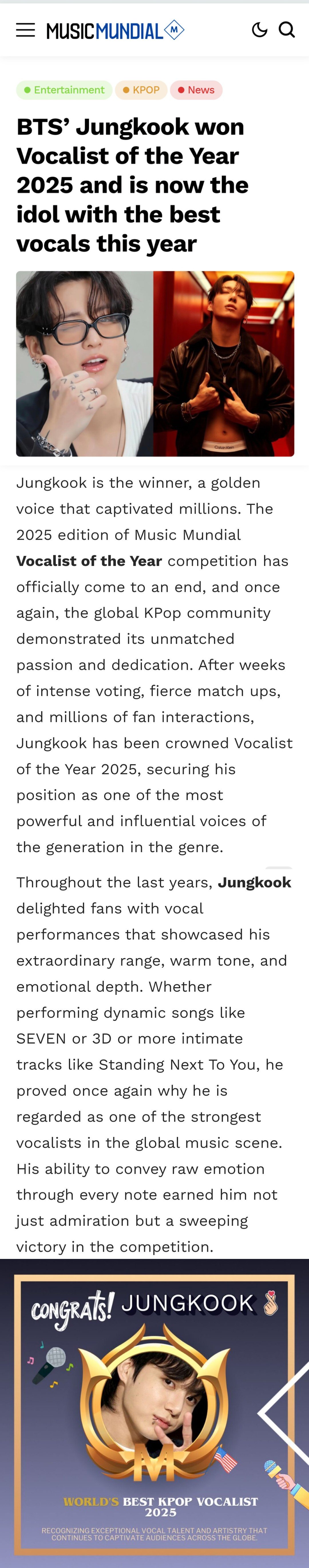 해외 음악 매체 ‘뮤직 문디알’은 공식 홈페이지를 통해 ‘2025년 최고의 K-팝 보컬리스트’ 투표 결과를 공개했고, 정국이 최종 1위를 차지했다. 해당 매체는 정국에 대해 “동세대에서 가장 강력하고 영향력 있는 보컬 가운데 한 명이라는 입지를 굳혔다”고 평가했다.