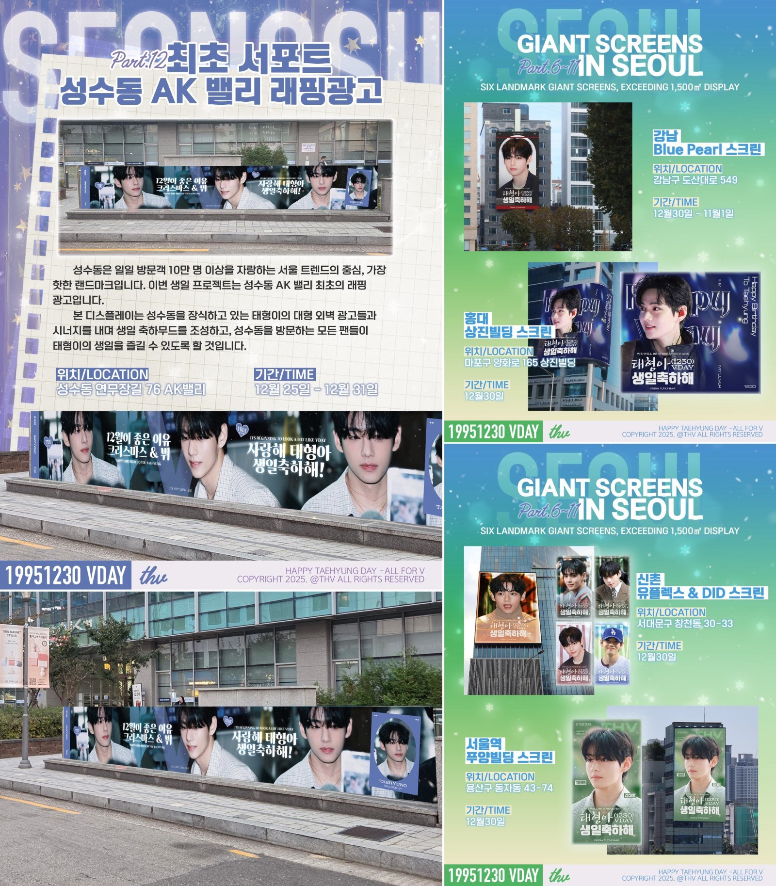 성수동에서도 별도의 이벤트가 준비됐다. 티르티르와 파라다이스시티 등 뷔의 대형 광고판이 설치돼 글로벌 팬들의 방문이 이어지고 있는 성수 AK 밸리에서는 생일 래핑 광고가 진행된다. 바이두뷔바는 성수동 대형 외벽에 걸린 뷔의 브랜드 광고와 함께 즐길 수 있도록 기획했다고 설명했다.