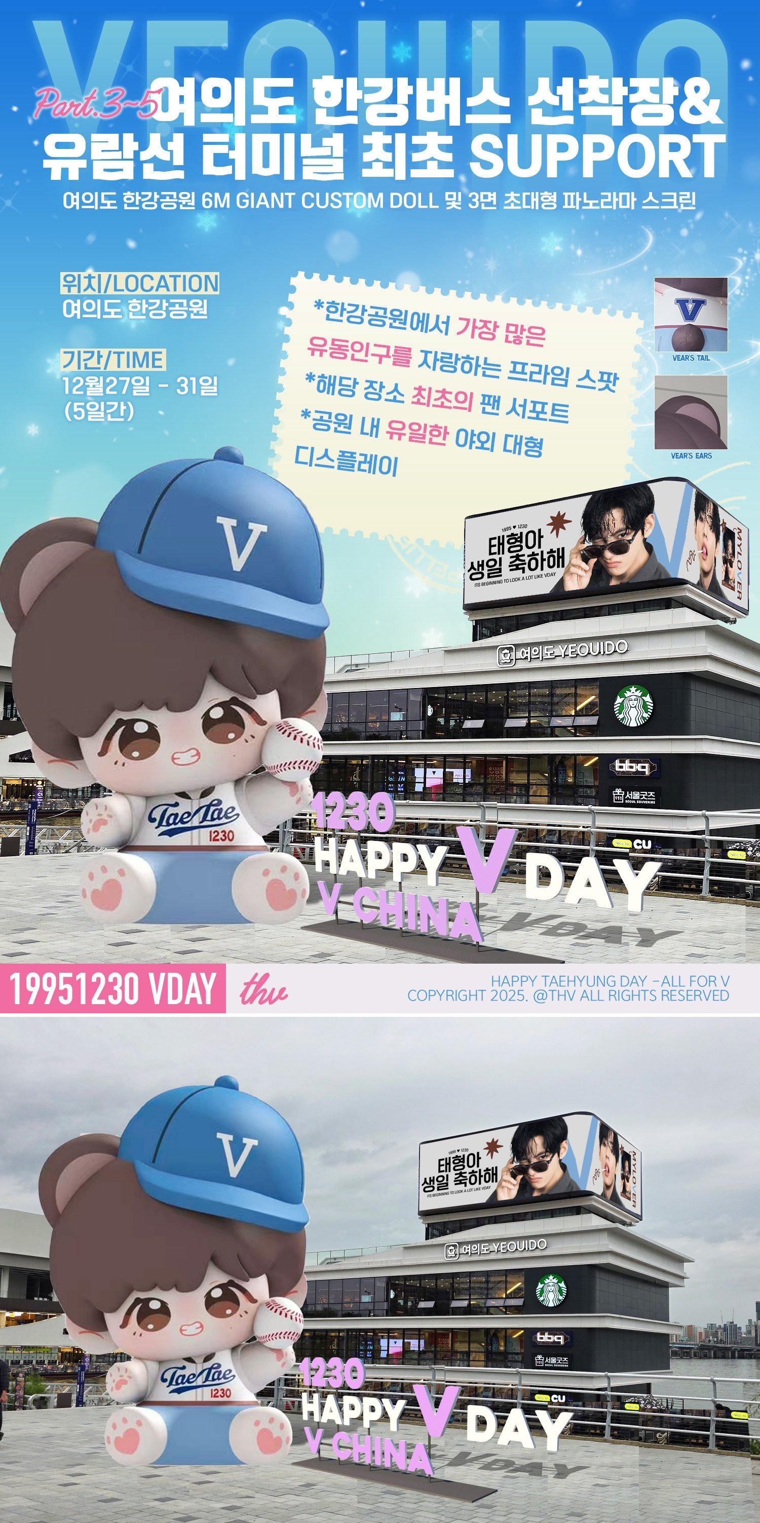 서울 한강공원 가운데에서도 유동인구가 많은 여의도 한강버스 선착장과 유람선 터미널이 첫 무대다. 아이돌 생일 서포트로는 처음으로 해당 공간에서 대형 프로젝트가 진행된다. 11월 새롭게 조성된 여의도 유람선 터미널 앞에는 높이 6미터에 이르는 대형 인형과 문구 조형물이 설치된다. 인형은 8월 26일 미국 로스앤젤레스 다저스타디움에서 시구자로 나섰던 뷔의 모습을 재현해 제작됐다.