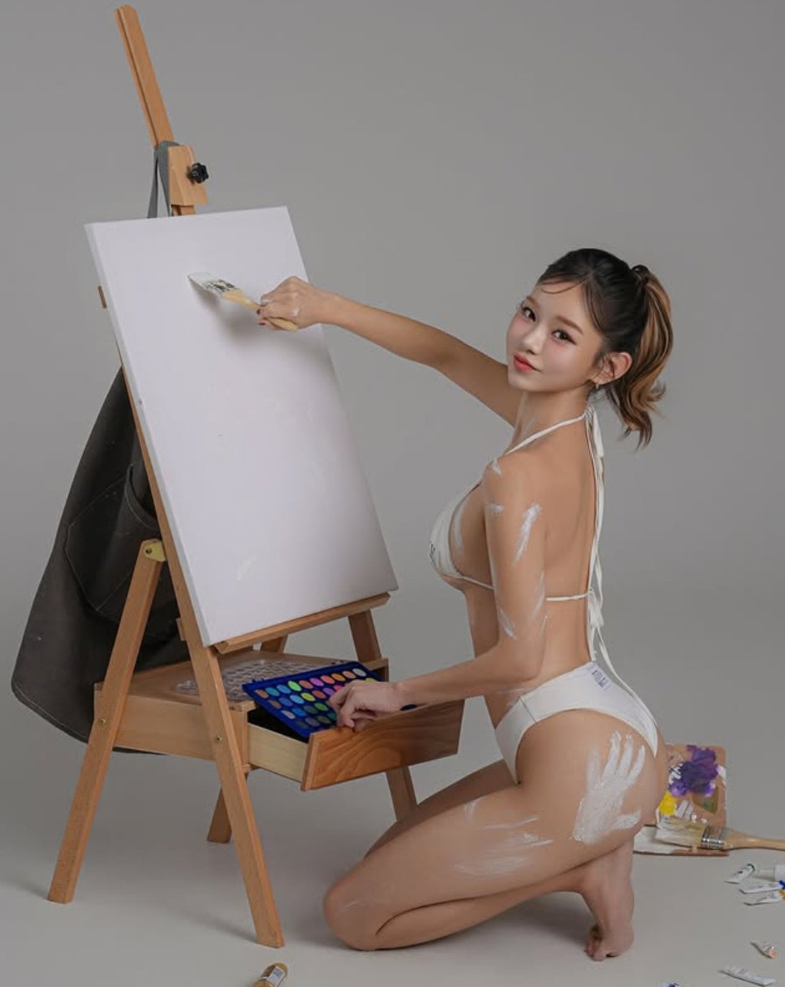 그림을 두 번만 더 그렸다가는 남아있는 옷이 없을 것 같은 수위 높은 흰색 비키니를 입은 그는 군살 하나 없는 탄탄한 몸매를 드러냈다. 엉덩이에 찍힌 손바닥 자국부터 온몸에 묻어 있는 하얀색 물감이 시선을 사로잡았다.