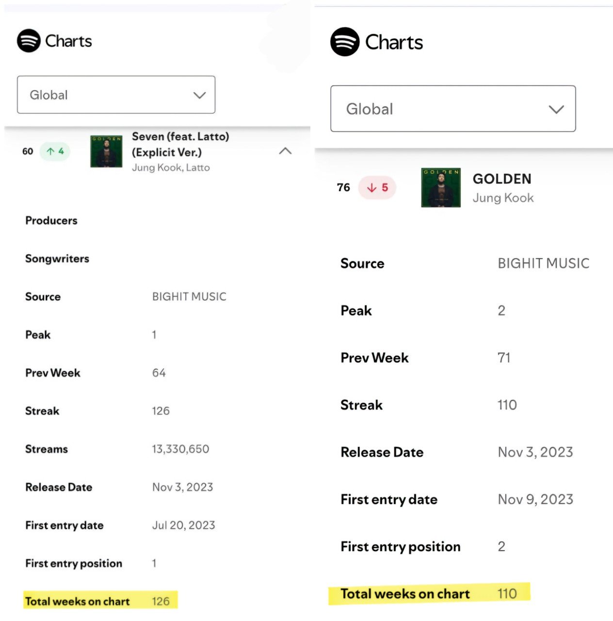 정국의 첫 솔로 앨범 ‘GOLDEN’ 역시 존재감을 분명히 했다. 같은 기간 스포티파이 ‘위클리 톱 앨범 글로벌’ 차트에서 76위를 기록했고, 이 차트에서도 아시아 솔로 가수 음반 최초이자 최장 기간인 110주 연속 차트인 기록을 세웠다. ‘GOLDEN’은 현재도 하루 평균 450만에 달하는 스트리밍을 나타내며 음반 저력을 이어가고 있다.