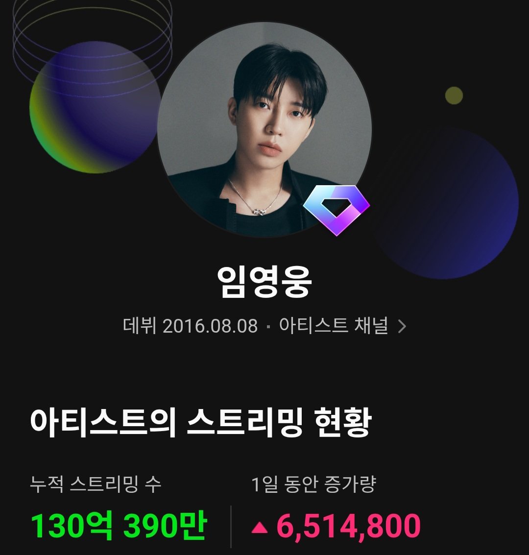임영웅은 2024년 6월 18일 누적 스트리밍 100억 회를 돌파하며 멜론 ‘다이아 클럽’ 아티스트 명단에 이름을 올렸다. 이는 멜론 내에서도 상위 극소수 아티스트에게만 허락된 지표다. 이로써 임영웅은 글로벌 톱 그룹 방탄소년단과 같은 기록 구간에 도달했고, 솔로 가수 기준으로는 가장 앞선 성적을 유지하고 있다.