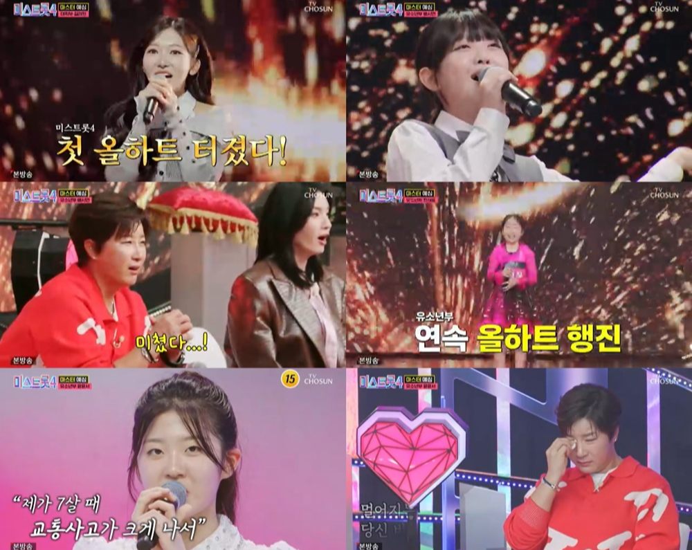 유소년부도 강했다. 배서연은 “뽀로로는 이제 그만”이라는 한마디로 등장했고 ‘안 올 거면서’로 올하트를 받았다. 전하윤은 연변 출신 최초 참가자로 소개됐고 귀여운 눈웃음과 가창으로 올하트를 받았다. 105만 구독자를 보유한 윤윤서는 ‘어머니의 계절’로 마스터들의 반응을 끌어냈고 올하트를 받았다. ‘미스트롯2’ 출신 김수빈은 5년 만에 돌아와 성숙해진 무대로 올하트를 받았다.