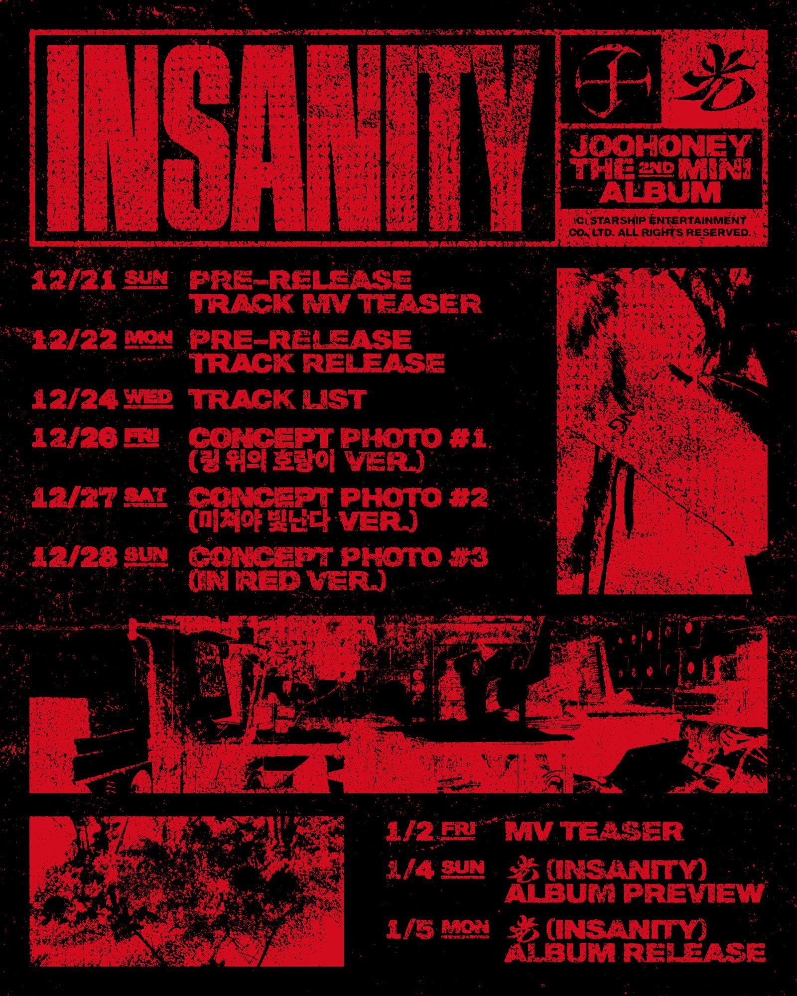 소속사 스타쉽엔터테인먼트는 지난 19일 몬스타엑스 공식 SNS 채널을 통해 주헌의 미니 2집 ‘光 (INSANITY)’ 앨범 스케줄러를 공개했다. 레드와 블랙 톤의 빈티지 포스터 형태로 제작된 해당 스케줄러는 다양한 티징 콘텐츠 일정으로 기대감을 더한 것은 물론, 복싱 경기장을 연상케 하는 감각적인 디자인으로 눈길을 끌었다.
