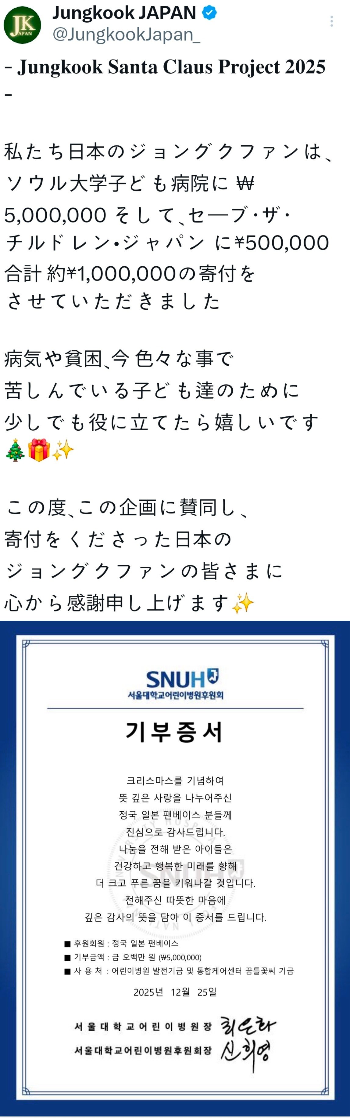 정국의 일본 팬클럽 ‘정국 재팬’은 ‘2025 산타 클로스 프로젝트’를 통해 서울대어린이병원에 500만원을 ‘정국 일본 팬베이스’ 명의로 기부했다고 소셜미디어 엑스(X·옛 트위터)를 통해 밝혔다.