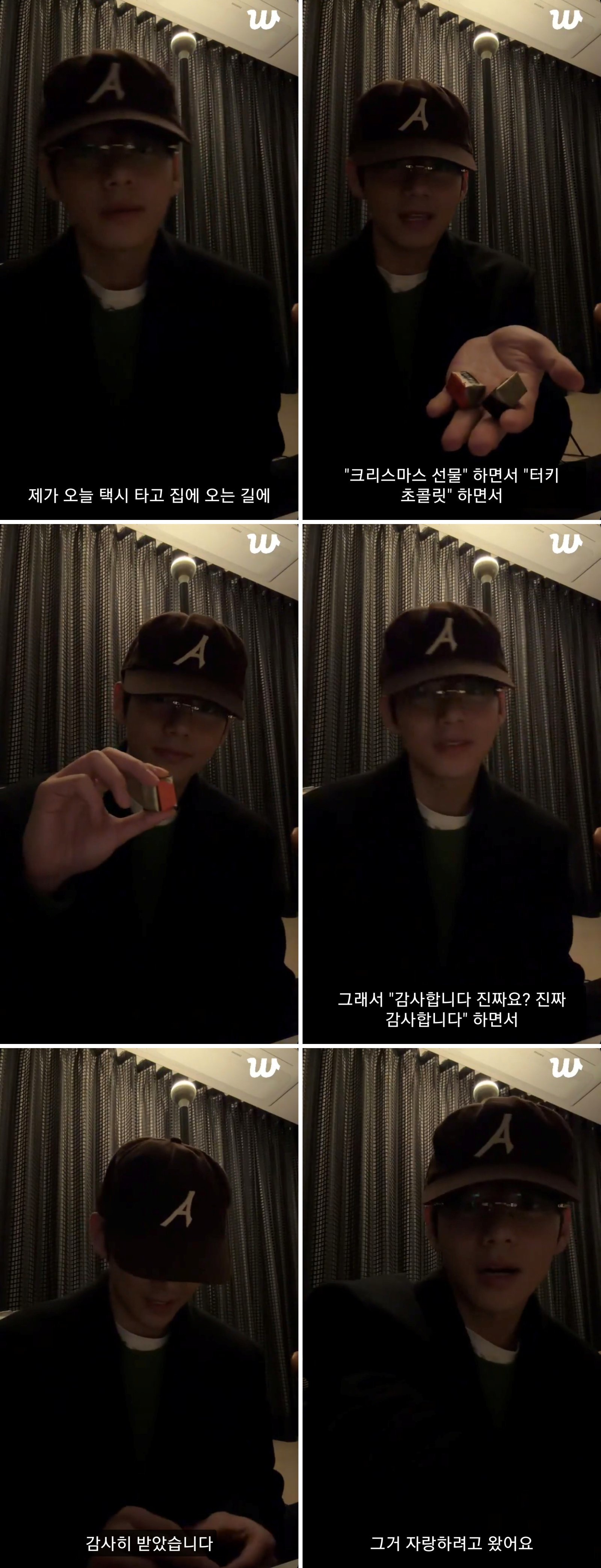 뷔의 손바닥 위에는 작은 초콜릿이 놓여 있었다. 그는 “오늘 택시 타고 집에 오는 길에 기사님이 ‘이건 깜짝 선물이에요. 크리스마스 선물, 터키 초콜릿’ 하시면서 주셨어요”라며 당시 상황을 전했다. 이어 “그래서 진짜 감사합니다 하고 받았어요. 그거 자랑하려고 왔어요”라고 말하며 환하게 웃었다.